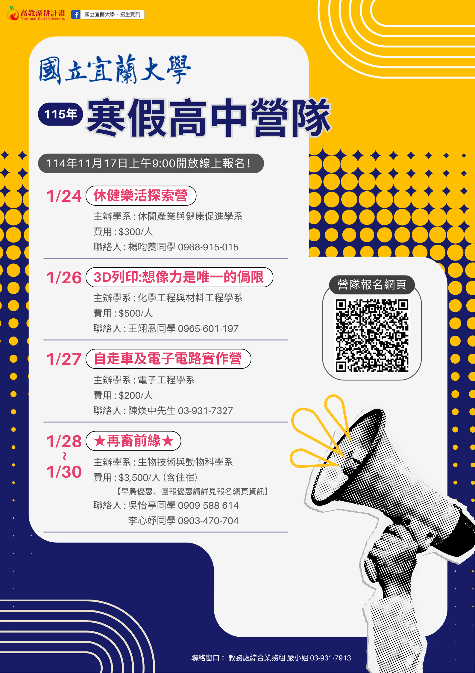 (網址:https://sites.google.com/ems.niu.edu.tw/115winter),或由國立宜蘭大學首頁(網址:https://www.niu.edu.tw)/招生資訊/在宜大夢想起飛/高中營隊查詢。