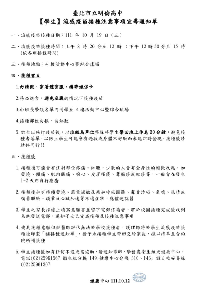 1.學校預訂於10/19日(三)進行流感疫苗接種,請有意願施打疫苗之老師於當天攜帶身分證及健保卡前往本校 4 樓活動中心暨綜合球場。
