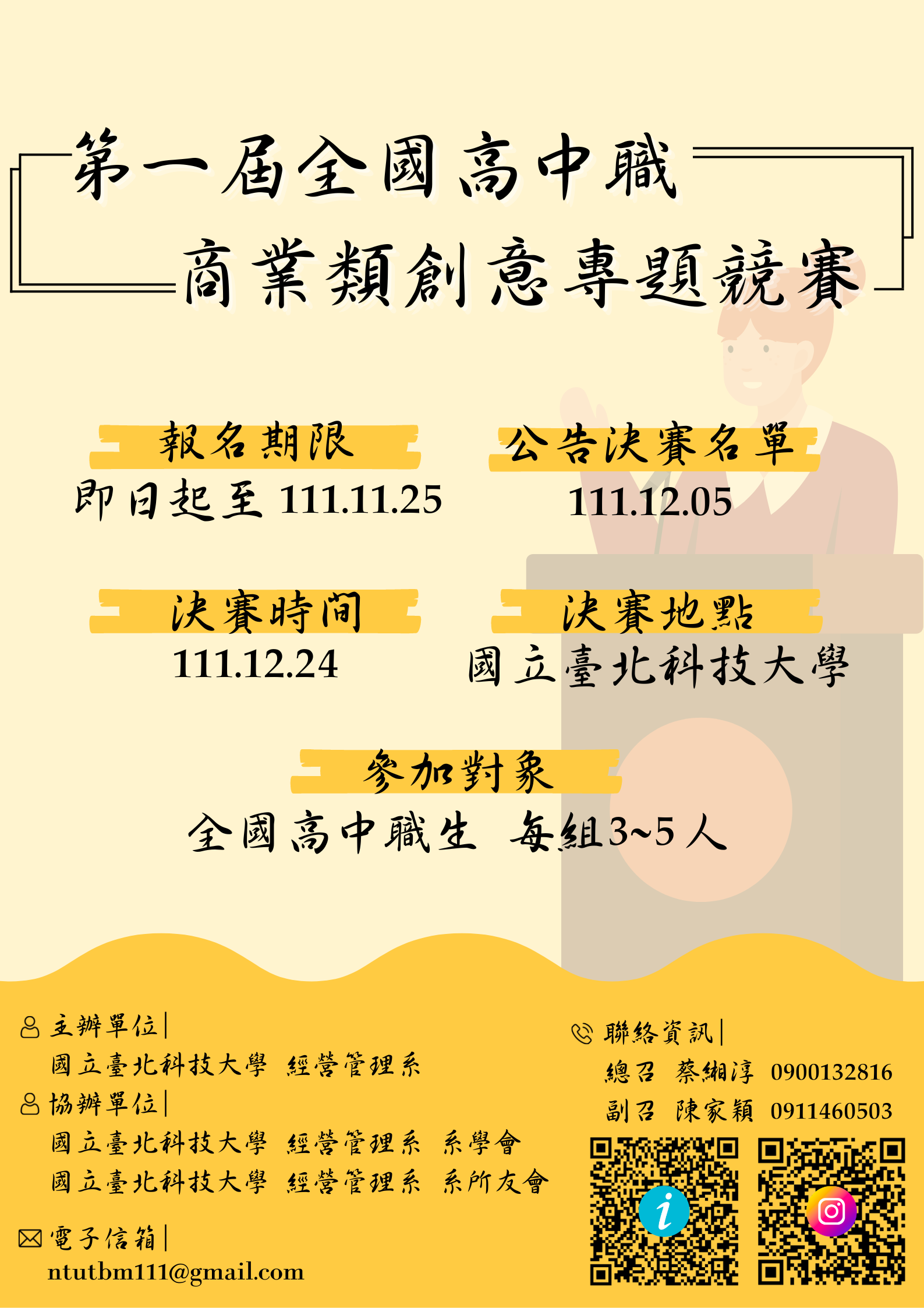 主旨:本校經營管理系舉辦「第一屆全國高中職商業類創意專題競賽」,敬請轉知並鼓勵學生踴躍參加,請查照。
