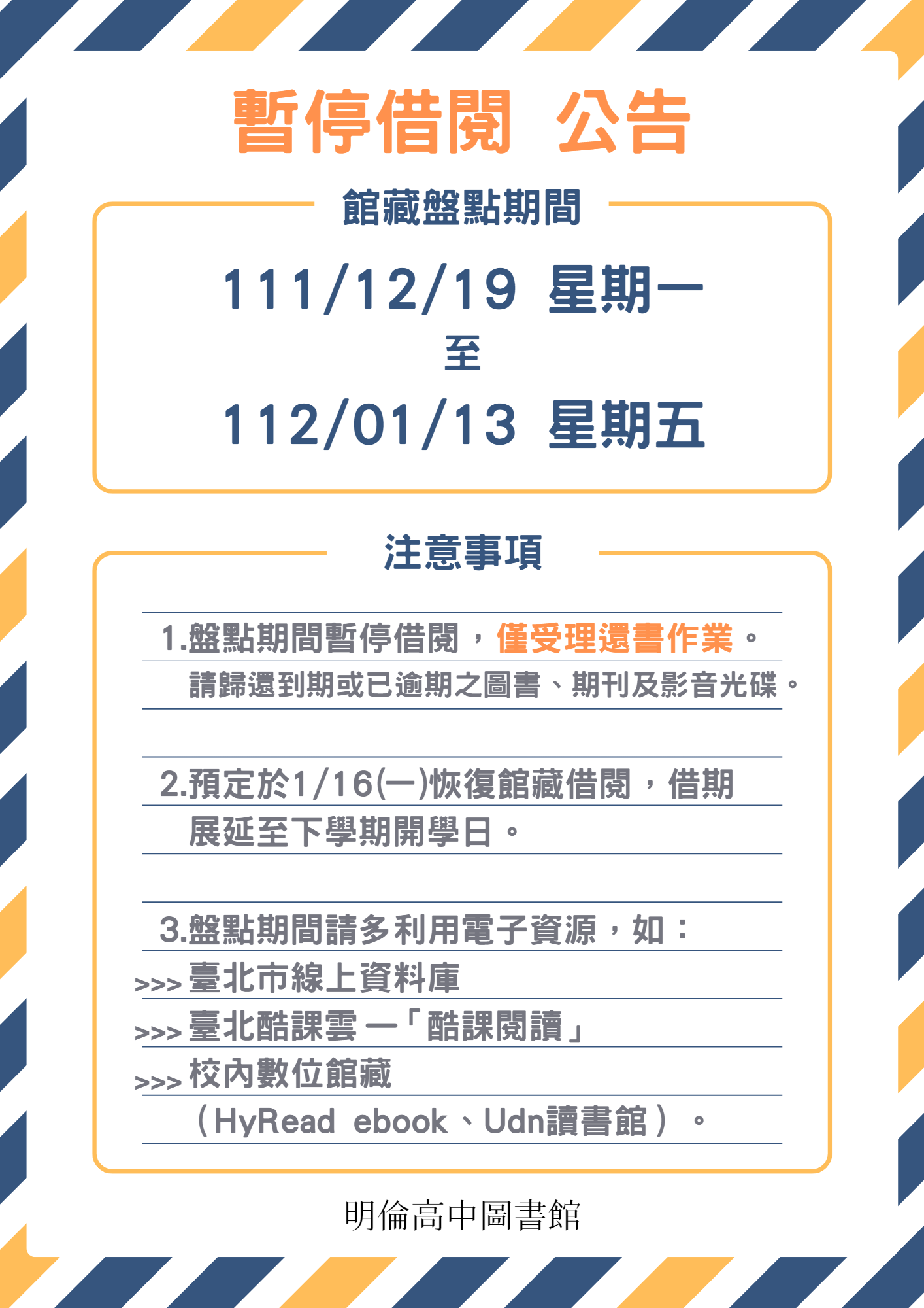 四、盤點期間請多利用電子資源,如:臺北市線上資料庫、臺北酷課雲─「酷課閱讀」、校內數位館藏 (HyRead ebook、Udn讀書館)。