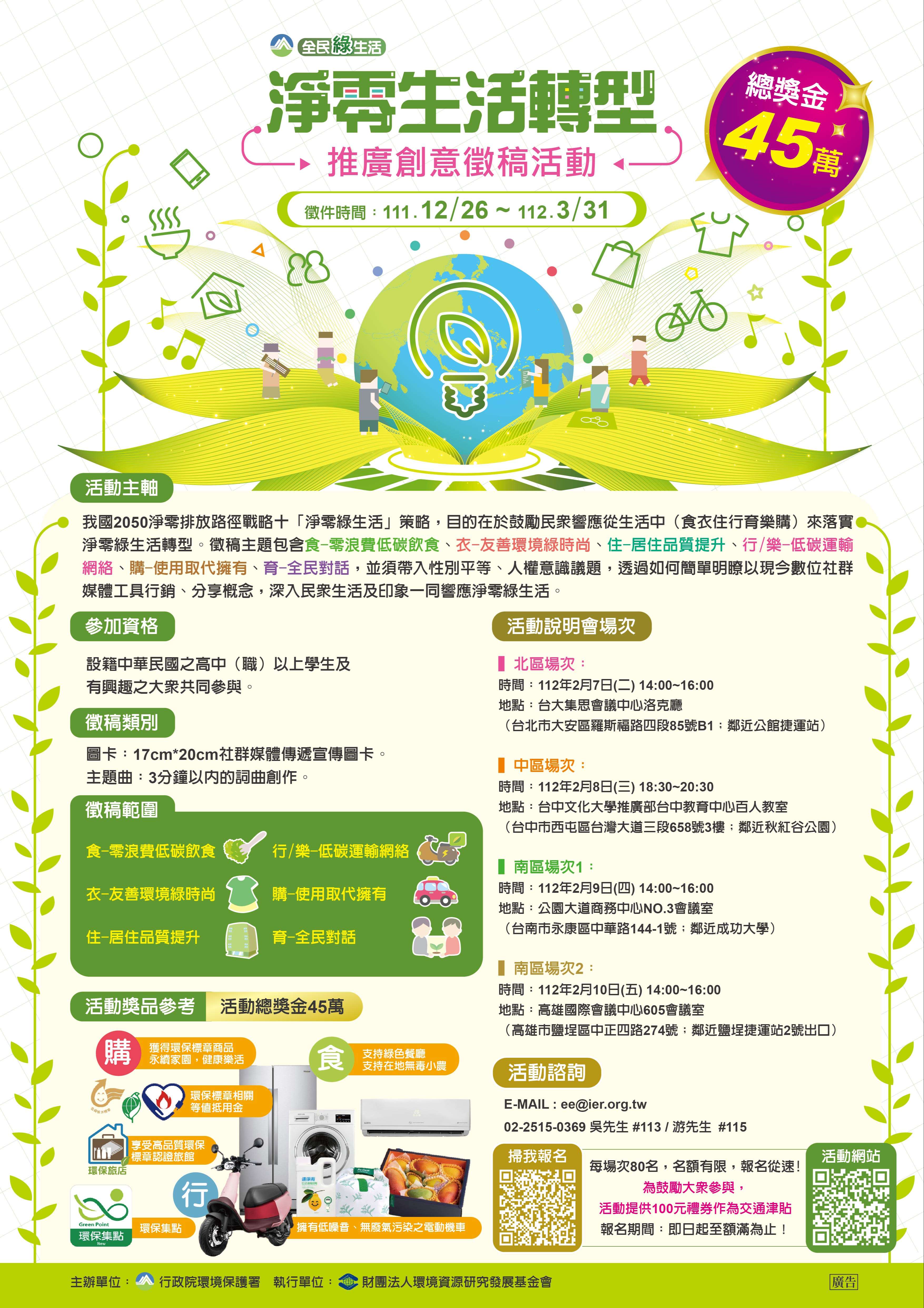 一、為鼓勵社會大眾了解淨零綠生活概念及激發創作靈感,環保署特辦理圖卡及主題曲徵稿活動競賽,鼓勵各界報名參加,並於112年2月7日至10日北、中、南區域辦理4場次徵稿活動說明會,敬請貴校協助轉知有興趣師生報名參加。