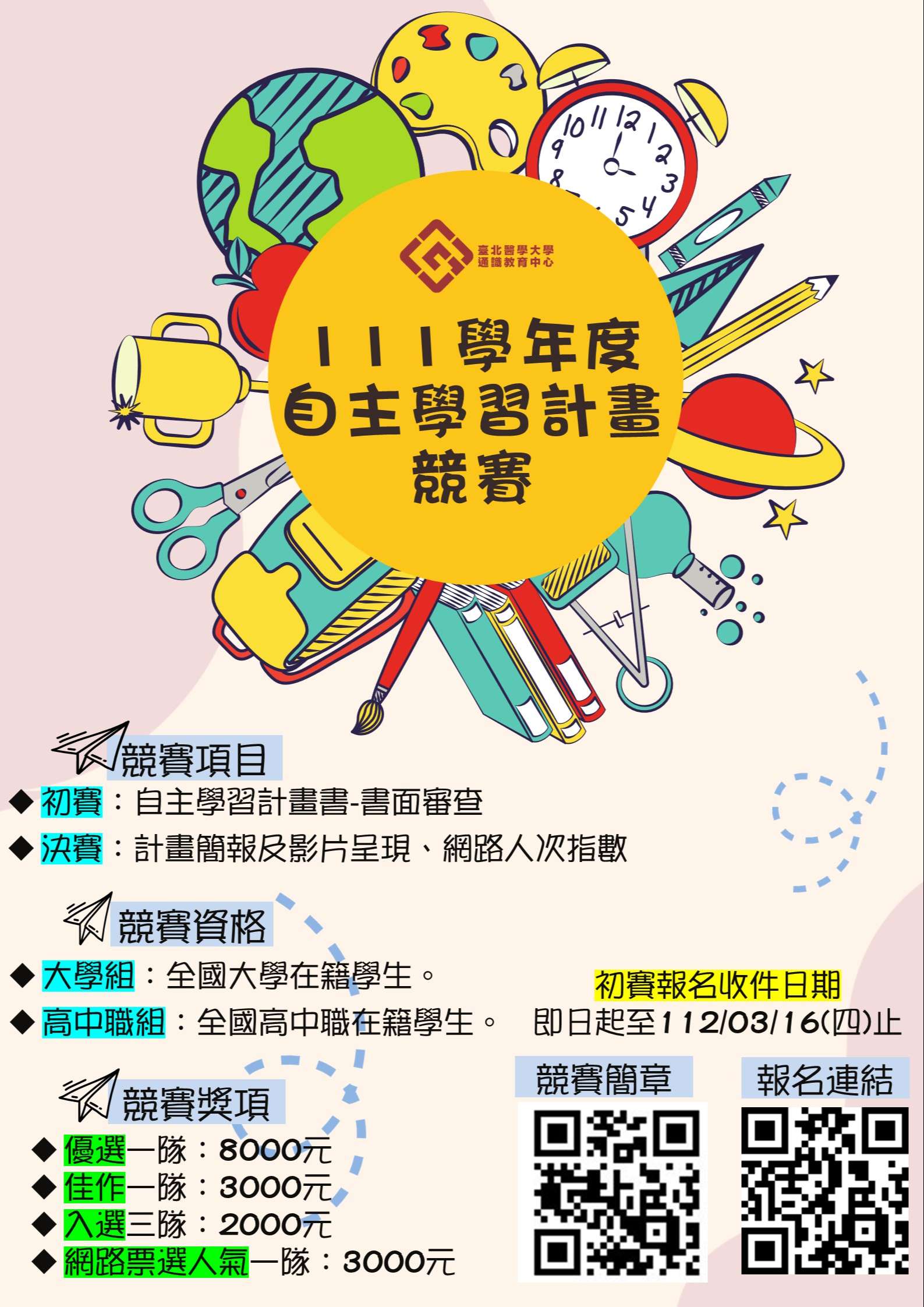 (三)報名及徵件:即日起至112年3月16日(四)截止,均採線上報名(https://reurl.cc/58WgyV),請參閱附件活動簡章或至臺北醫學大學通識教育中心網站、Facebook粉絲 專頁(https://www.facebook.com/TMUGE)之本活動競賽公告報名。