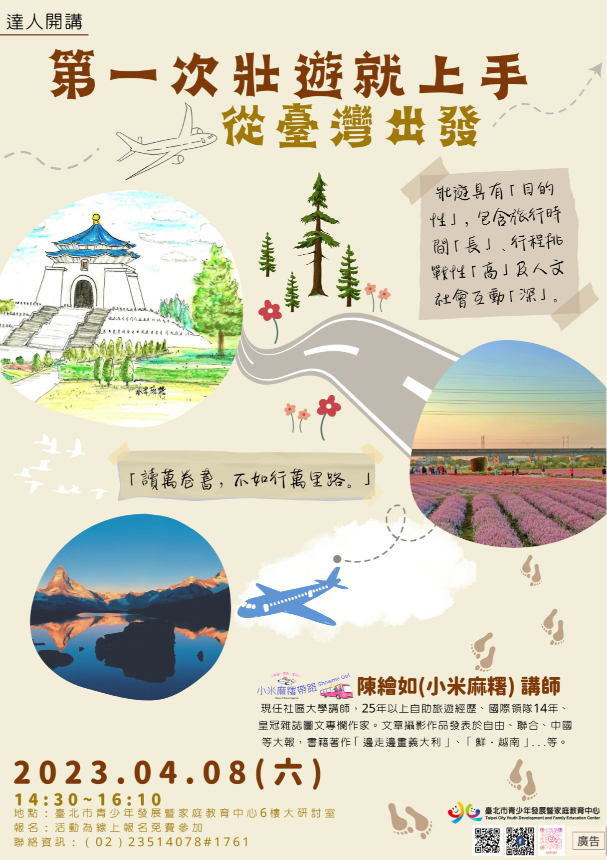(三)30字:青發家教中心4/8陳繪如開講:第一次壯遊就上手 從臺灣出發。活動免費詳官網。