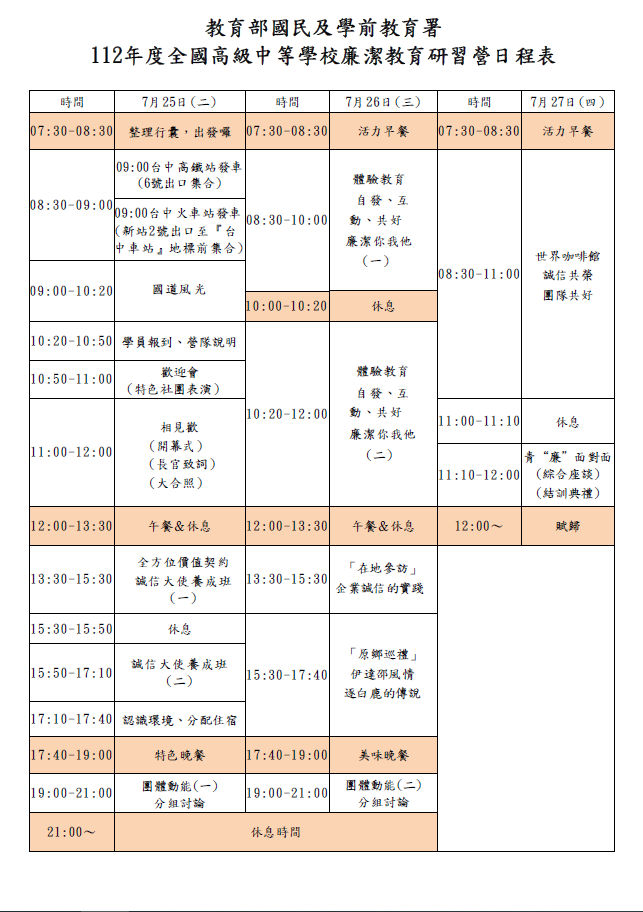 二、為提供多元學習廉政管道,培養學生誠信廉潔品操,本署針對公私立高級中等學校學生規劃3天2夜營隊活動,內容