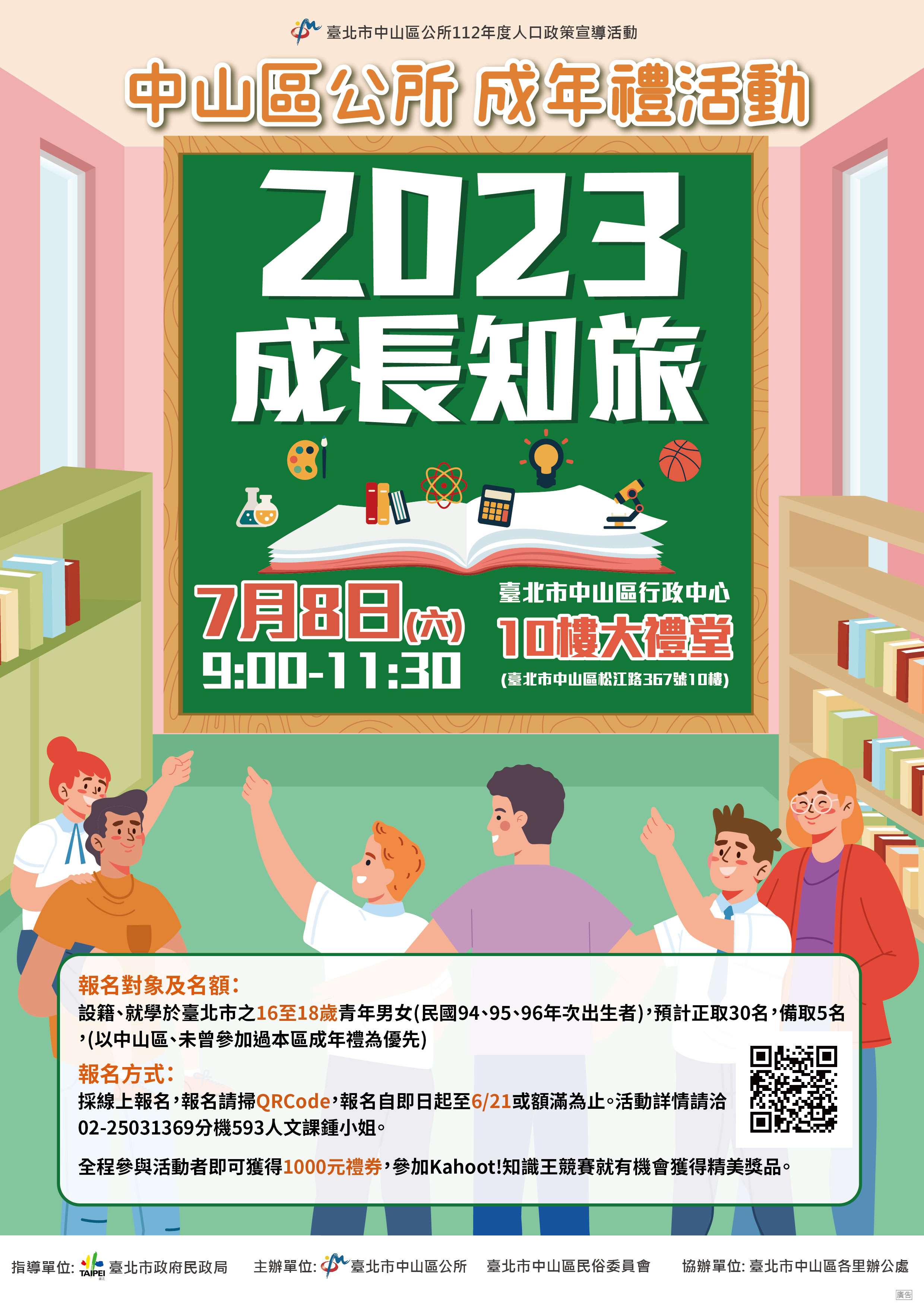 二、請協助刊登宣傳訊息如下:「臺北市中山區公所112年度成年禮活動『2023成長知旅』將於112年7月8日(星期六)上午9時舉辦,即日起開放報名至6月21日或額滿為止,歡迎設籍或就讀臺北市高中職、大專院校之16至18歲青年學子(民國94、95、96年次)踴躍報名參加!全程參加者可獲得1,000元禮券1份!詳細活動內容請參閱活動簡章。報名網址:https://forms.gle/EsDpHjyXDEggVne58。活動相關問題請洽(02)25031369轉593人文課鍾小姐。」