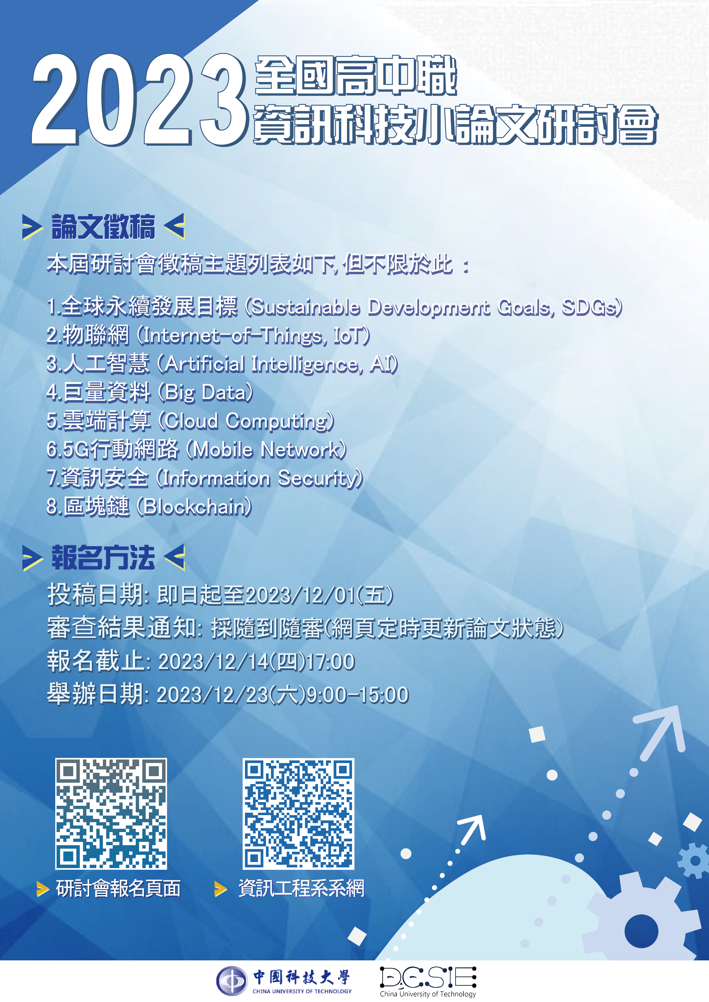 一、2023全國高中職資訊科技小論文研討會訂於2023年11月25日(星期六)於中國科技大學台北校區舉行,歡迎全國高中職學生踴躍投稿。