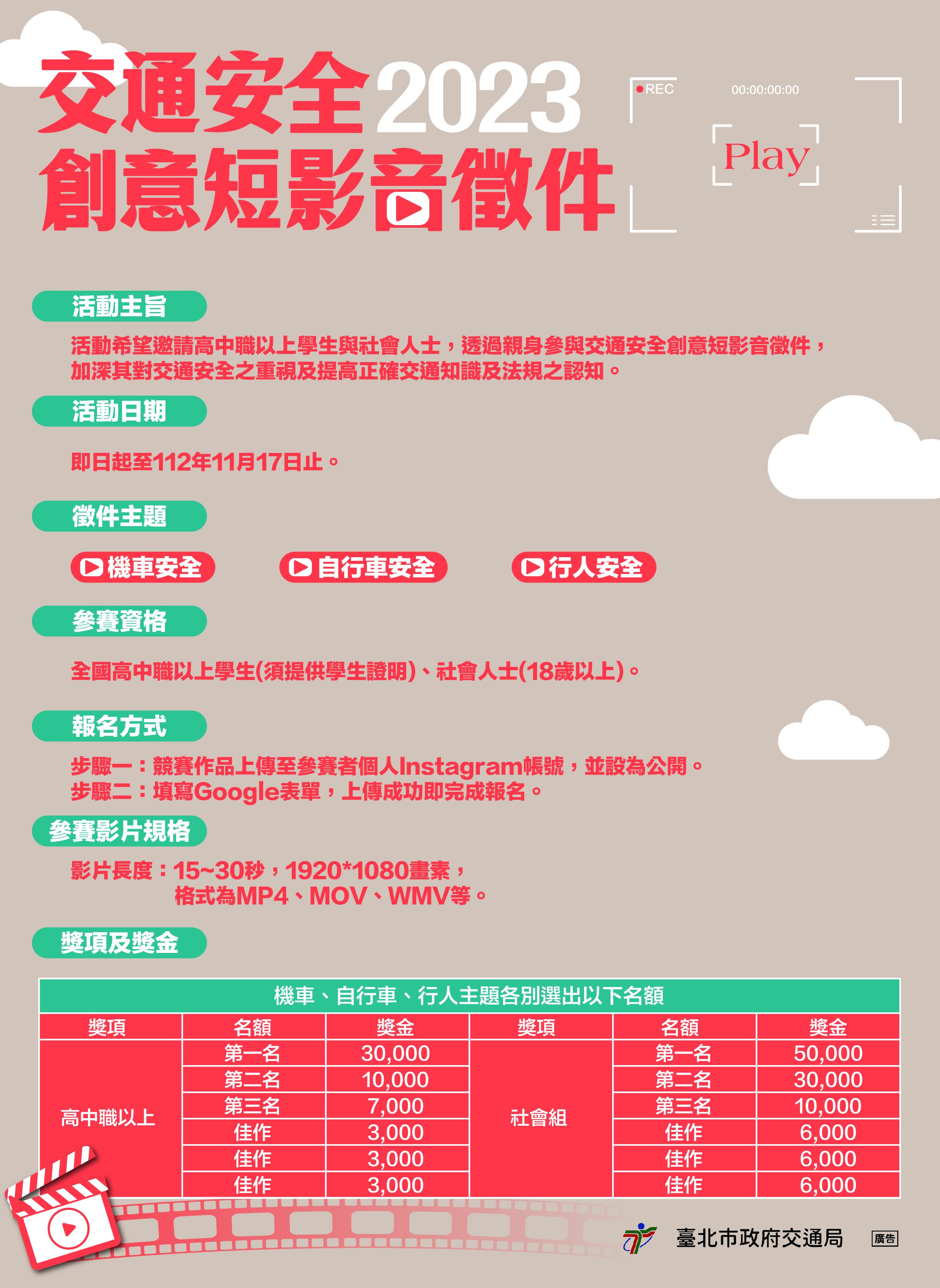 一、為強化民眾交通安全意識,透過親身參與交通安全創意短影音徵件,加深對交通安全之重視及提高正確交通知識及法規之認知,辦理「交通安全創意短影音徵件」競賽。