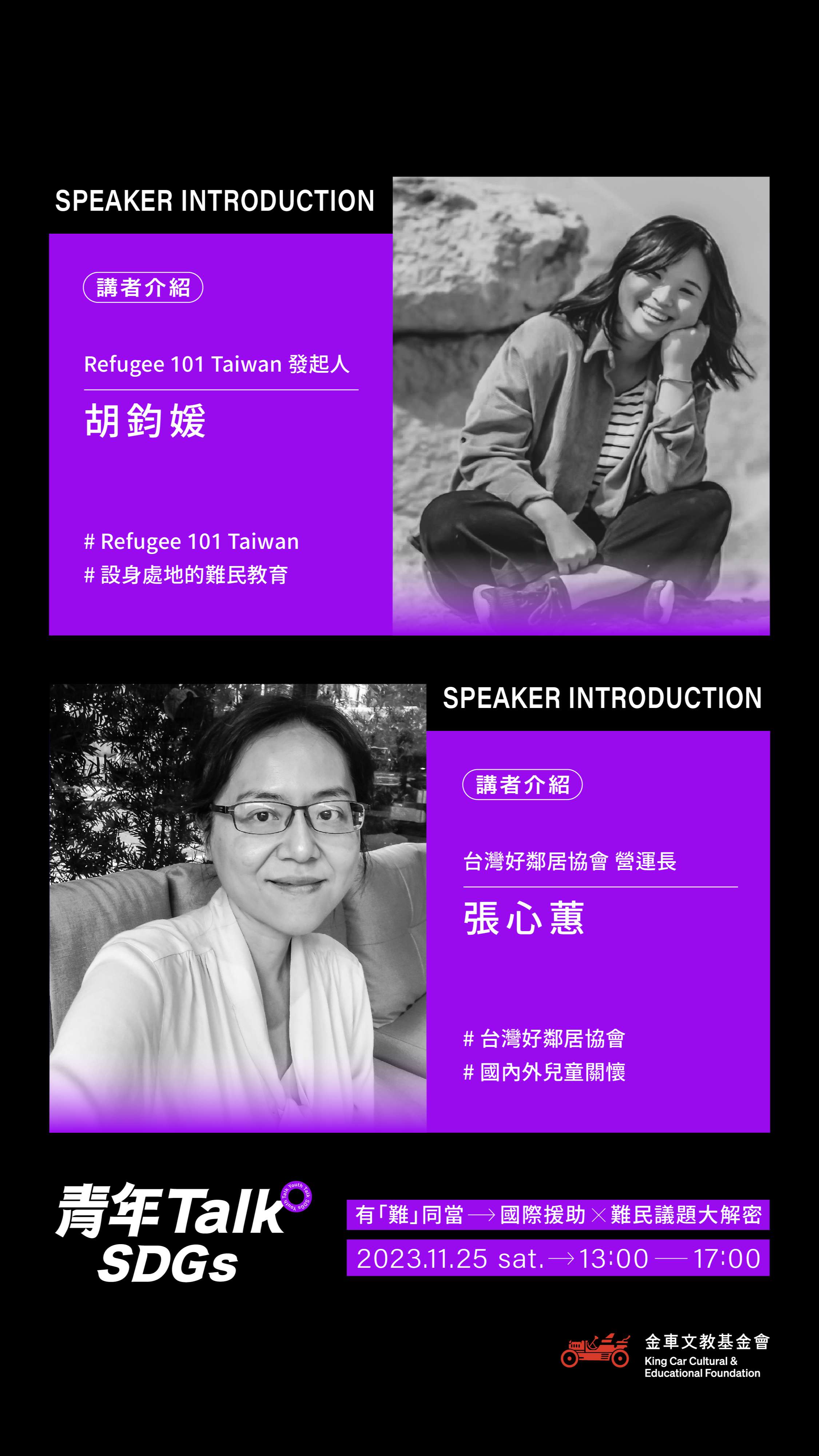 一、金車文教基金會本次邀請【台灣好鄰居協會】營運長張心 蕙及【Refugee 101 Taiwan】發起人胡鈞媛,探討SDG16 「促進和平多元的社會,確保司法平等,建立具公信力且 廣納民意的體系」相關議題。透過兩位講者的分享與議題 探討,期待更多青年朋友能激盪出框架外的想法與行動。