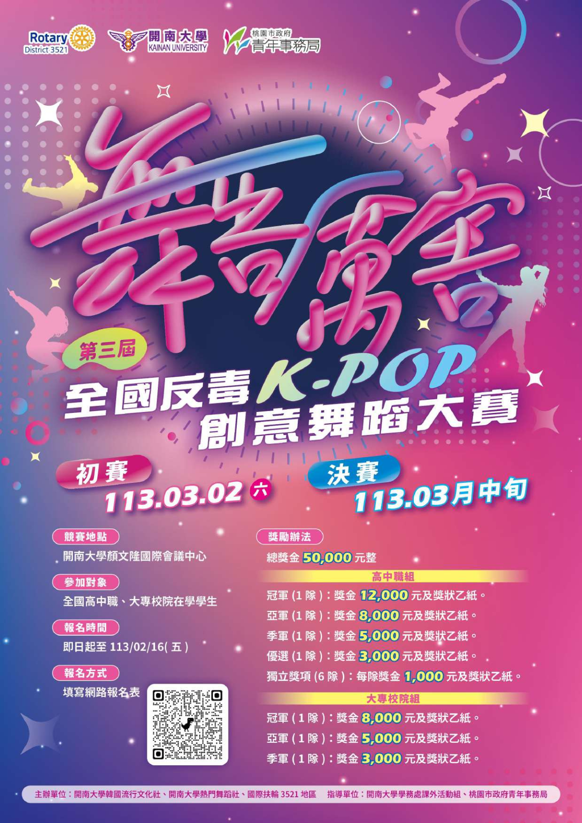 開南大學辦理第三屆「舞告厲害」全國反毒 K-POP創意舞蹈大賽活動相關資訊如附件。