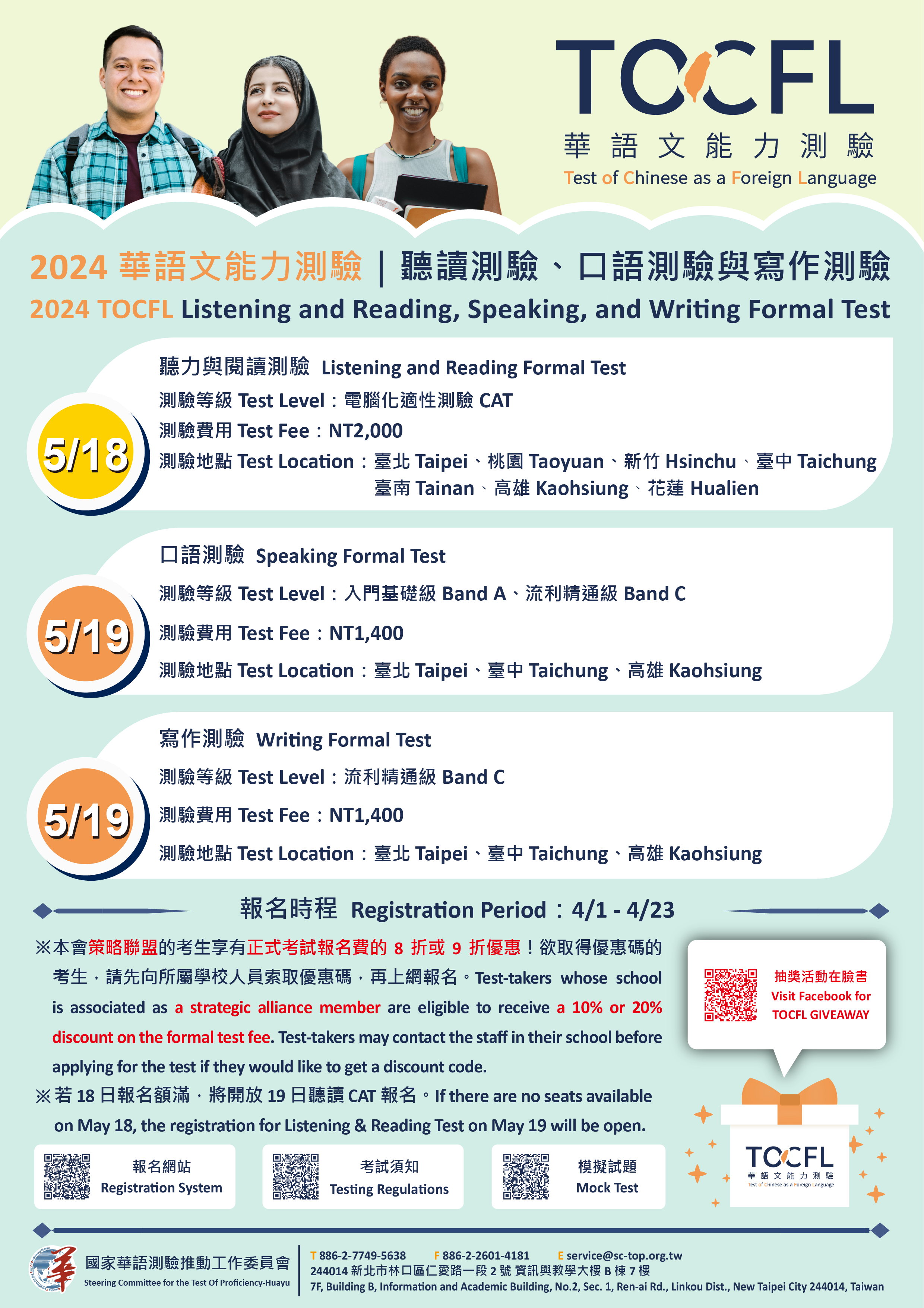 說明: 一、依據國家華語測驗推動委員會113年3月29日華測字第 1132000050號函辦理。 二、報名時程:自113年4月1日(星期一)起至4月23日(星期 二)止,報名截止日後,若有剩餘名額,將開放追加報名 至4月26日(星期五)止。 三、考試日期與項目: (一)113年5月18日(星期六):聽讀測驗(電腦化適性測 驗)。 (二)113年5月19日(星期日) 1、口語測驗:Band A、Band C。 2、寫作測驗:Band C。 3、聽讀測驗(若星期六場次額滿,將加開星期日電腦化 適性測驗)。 四、測驗地點:國立臺灣師範大學、國立臺北教育大學、國立 臺灣大學、中國文化大學、銘傳大學、中原大學、國立清 華大學、東海大學、靜宜大學、國立成功大學、文藻外語 大學及慈濟大學等共計12所考試中心。 五、測驗費用 (一)聽讀考試:新臺幣(以下同)2,000元。 (二)口語考試:1,400元。 (三)寫作考試:1,400元。 六、優惠訊息 (一)同時報考聽讀、口語和寫作考試三項測驗,可以享八折 優惠。 (二)為該會策略聯盟單位,所屬外籍人士可享九折優惠。 七、抽獎活動:凡報考口語或寫作測驗並完成繳費者,可參加 華測FB粉絲專頁抽獎活動。詳情請見粉絲專頁貼文: https://www.facebook.com/SCTOP.TOCFL。 八、報名網址:https://reg.sc-top.org.tw/。 九、線上模擬測驗:https://tocfl.edu.tw/index.php/exam /test/page/19。 十、倘對本測驗尚有疑問,請逕洽該會承辦人員王郁涵小姐, 聯絡電話:02-77498204。 十一、檢附旨案宣傳海報1份。
