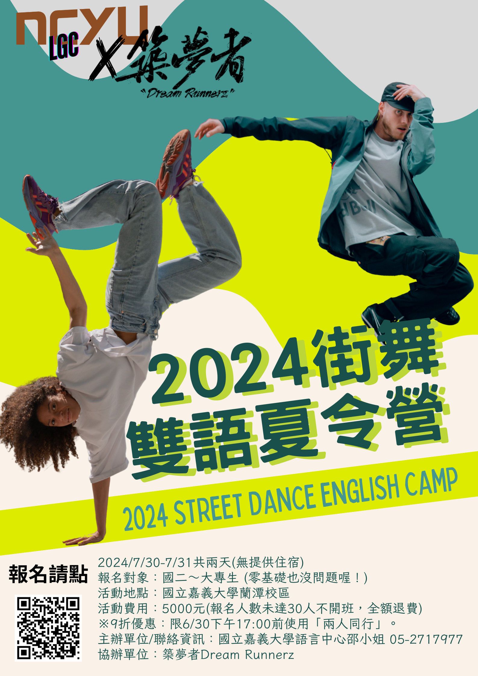 說明: 一、「2024年巴黎奧運」正式將街舞中之霹靂舞列為比賽項 目,街舞躍上奧運舞台,從街頭文化正式登上國際體壇。 此街舞雙語夏令營訴求結合活力四射之街頭舞蹈及英語學習(英語+動感),特別邀請街舞征戰經驗豐富且專業精湛之 「築夢者」教師授課。 二、活動相關訊息如下: (一)日期:113年7月30日(星期二)至7月31日(星期三),共2 天(無提供住宿)。 (二)地點:本校蘭潭校區綜合教學大樓。 (三)報名時間:即日起至113年7月16日(星期二)。 (四)報名連結:https://forms.gle/o2eNRDc8FTAYLJwT6。 三、其餘活動資訊,請至以下網址查看:https://www.ncyu. edu.tw/lgc/Contents?nodeId=61116。