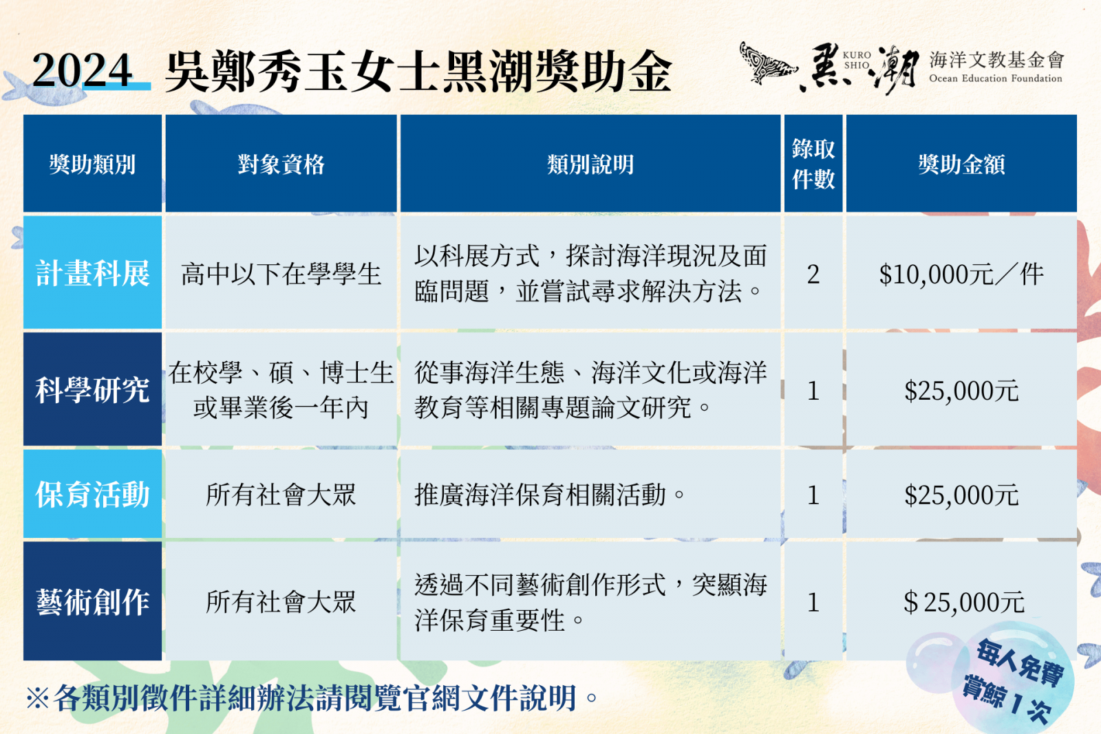 台灣四面環海,地理與海洋環境交融形塑島嶼之豐富生態與文化。為鼓勵在學學生與一般社會大眾踴躍發起並參與海洋事務,自2013年起,作家吳明益與母親吳鄭秀玉女士每年資助100,000元成立「吳鄭秀玉女士黑潮獎助金」,持續鼓勵並支持各項「以海為題」之研究與創作。