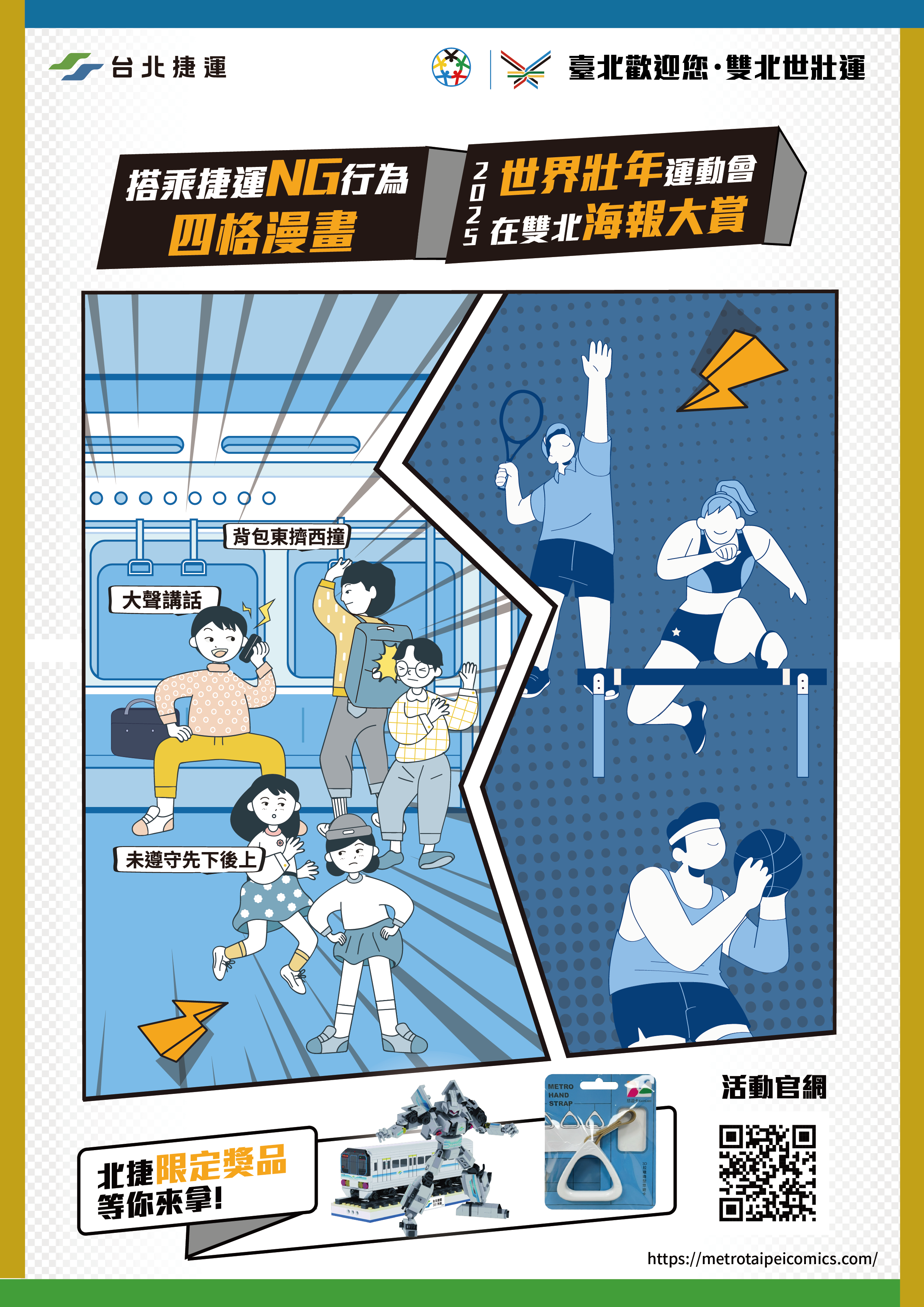 函轉臺北大眾捷運股份有限公司於114年3月24日至4月6日舉辦「搭乘捷運NG行為四格漫畫」暨「2025年世界壯年運動會在雙北宣傳海報」徵稿活動,請查照。