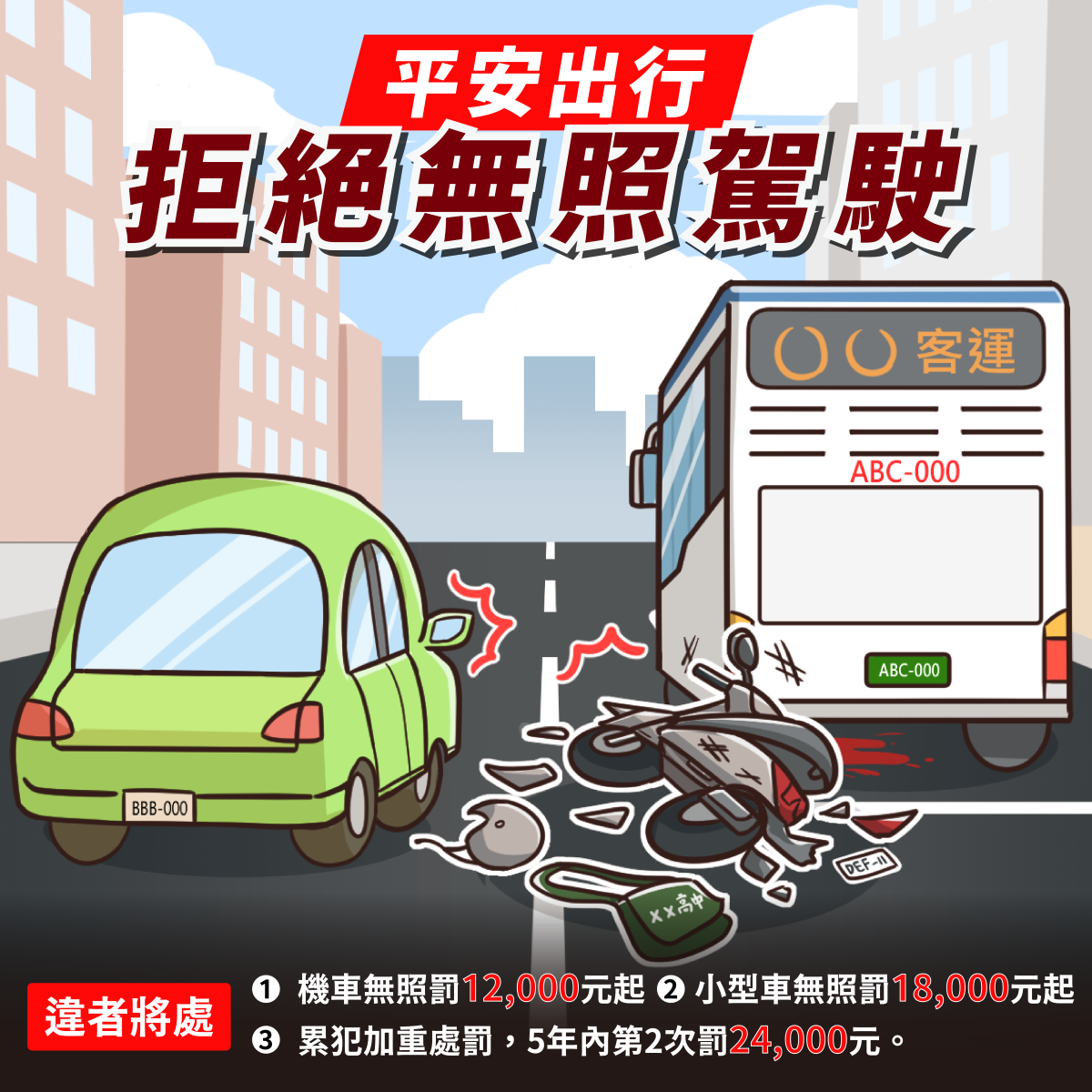 為加強防制無照駕駛及宣導相關罰則,請貴單位即日起至114年12月31日運用所屬管道協助宣傳,請查照。