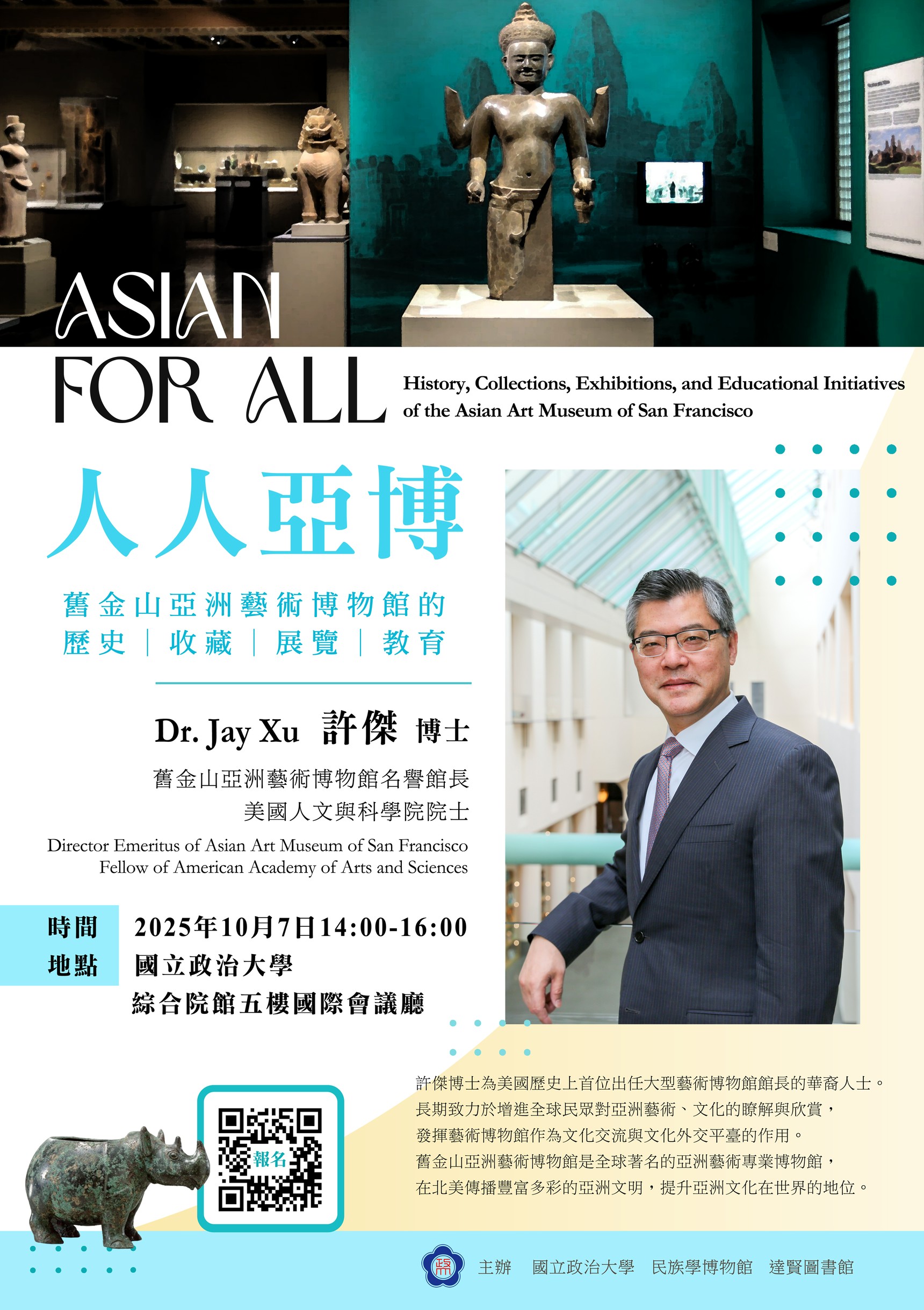 一、本次講座特別邀請美國舊金山亞洲藝術博物館名譽館長許傑博士擔任主講人。許博士於西元2015年獲選為美國人文與科學院院士,並於西元2017年擔任館長期間,促成該館與國立故宮博物院締結為姊妹館。任內致力於推動全球對亞洲藝術與文化之認識與欣賞,強化博物館作為國際交流與文化外交的重要平臺。