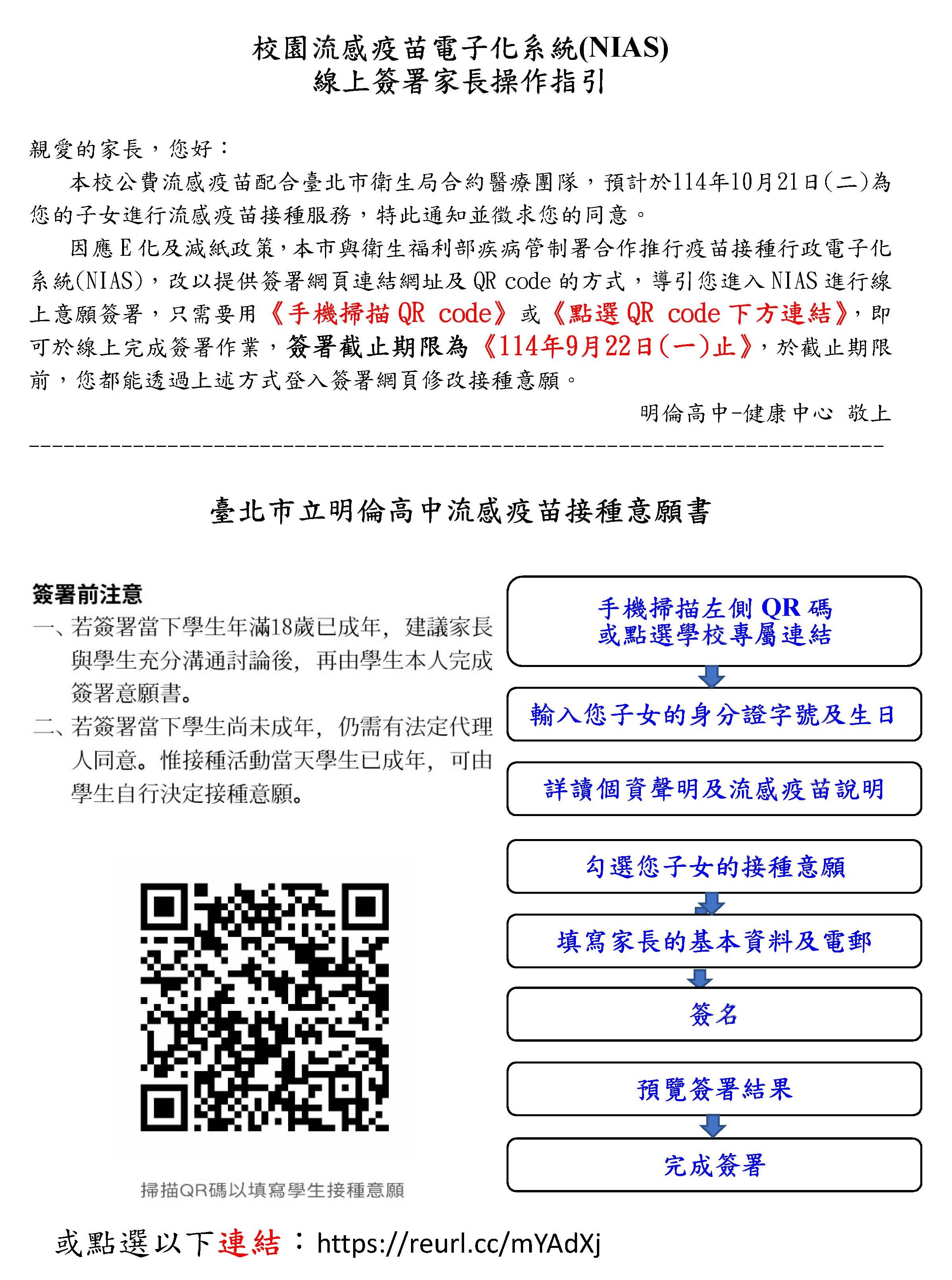 1.本校流感疫苗接種日期訂於114年10月21日(全天)!