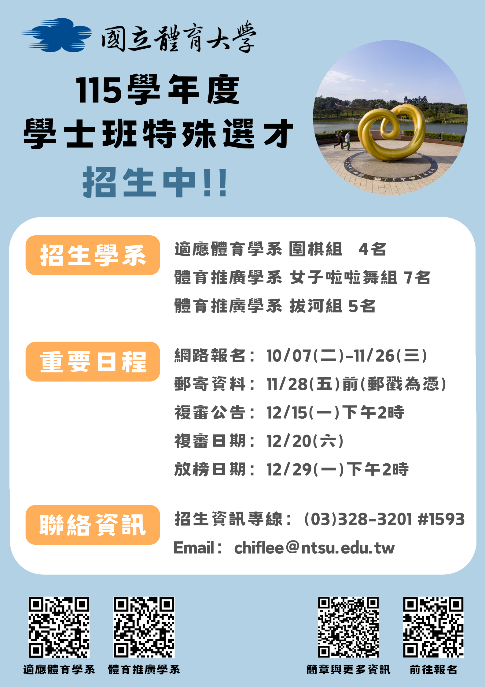 (二)體育推廣學系:女子啦啦舞組、拔河組,名額合計12名。