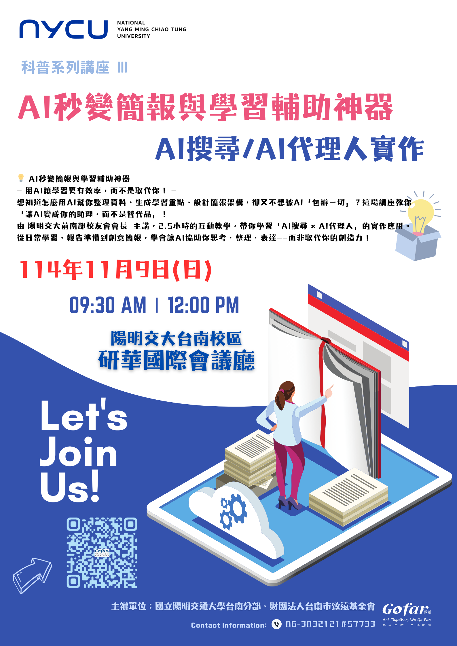 六、檢附講座活動海報供參。詳細科普系列活動請至活動網站https://tainangofar.web.nycu.edu.tw/查詢、報名,或洽活動聯絡窗口:劉小姐(06)3032121分機57733。
