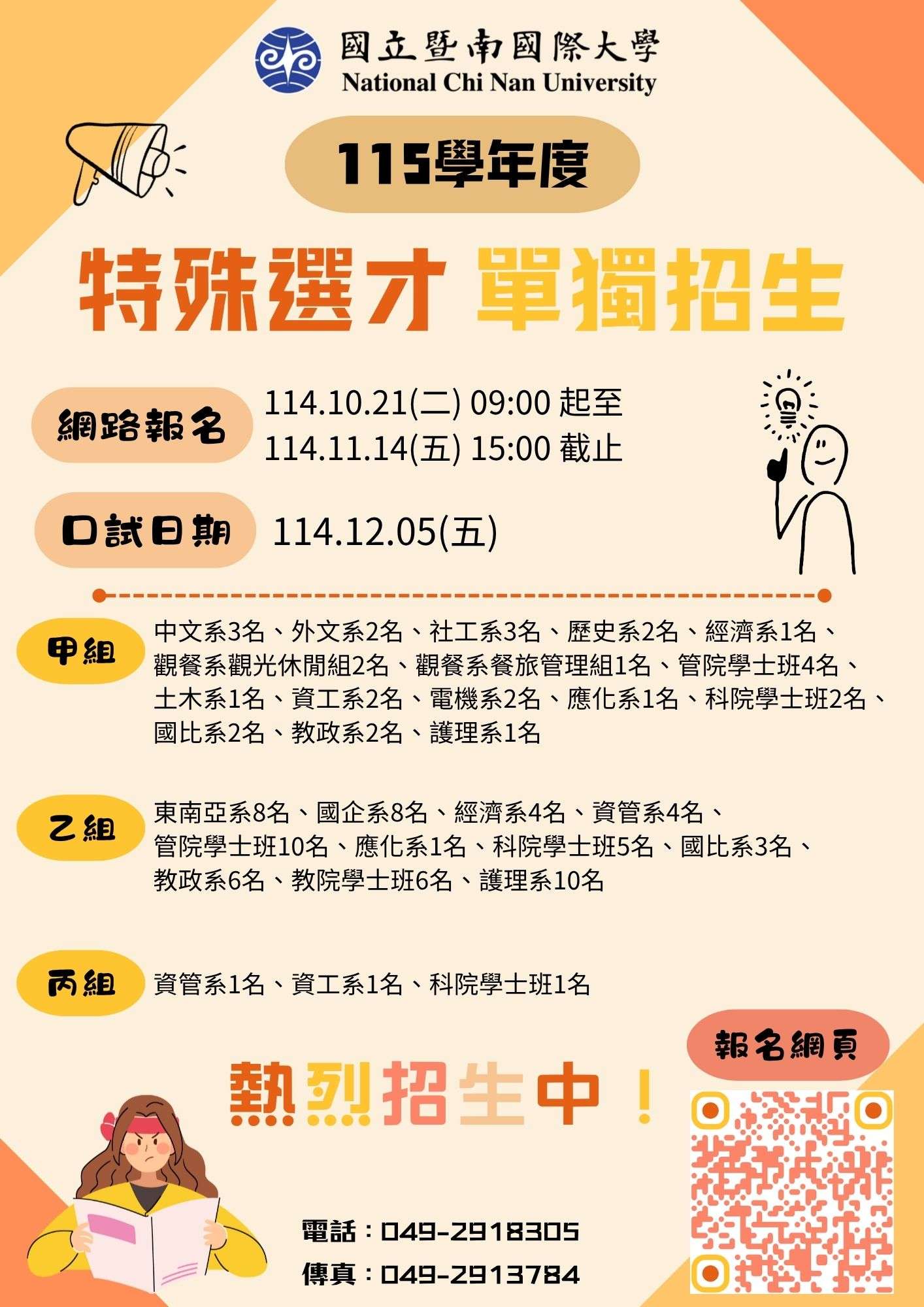 一、本校115學年度特殊選才單獨招生網路報名自114年10月21日起至114年11月14日止。