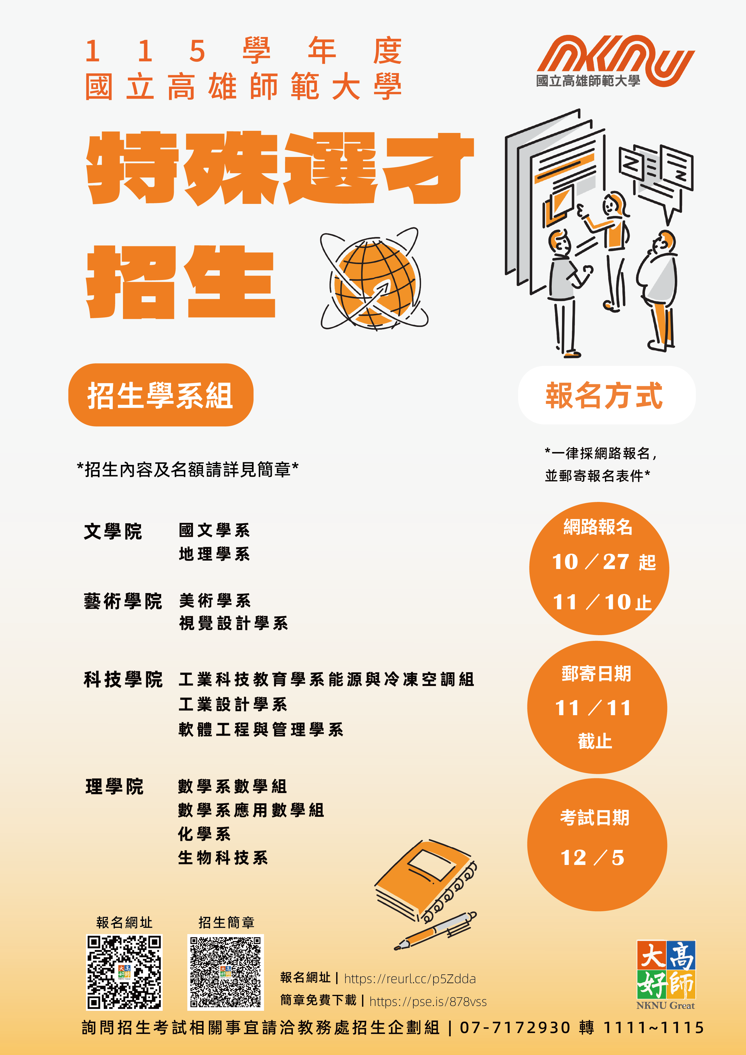 一、國立高雄師範大學針對不同教育資歷及具特殊才能之學生,提供多元彈性選才方式,不參採學測成績,透過書面審查及面試,錄取真正具有熱忱及潛力之學生。