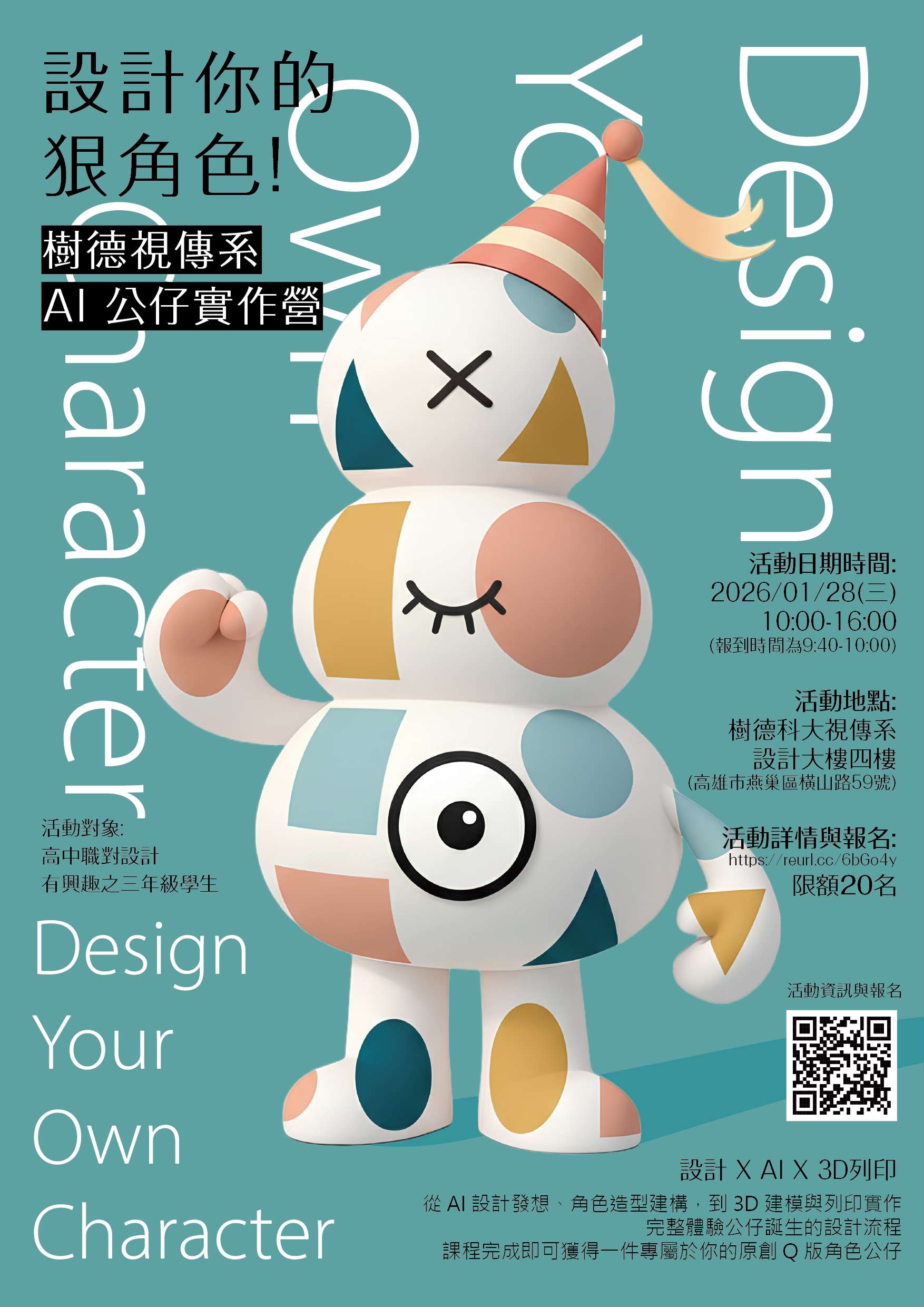 一、本營隊從AI設計發想、角色造型建構,到3D建模與列印實作,完整體驗公仔誕生的設計流程,課程完成即可獲得一件專屬於你的原創Q版角色公仔,活動一律免費並發給研習證書。