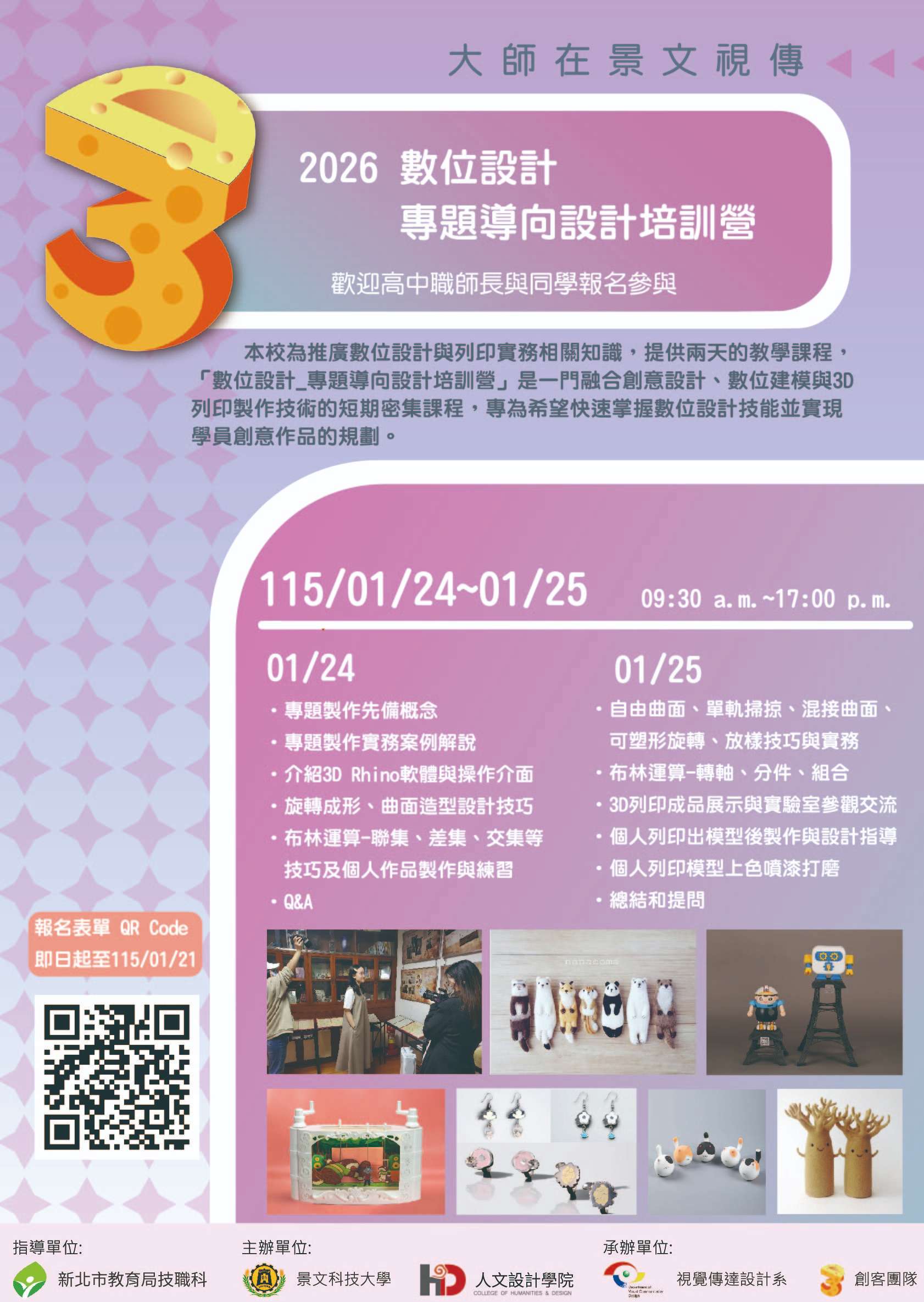 一、「數位設計_專題導向設計培訓營」是一門融合創意設計、數位建模與3D列印製作技術的短期密集課程,專為希望快速掌握數位設計技能並實現學員創意作品的規劃。