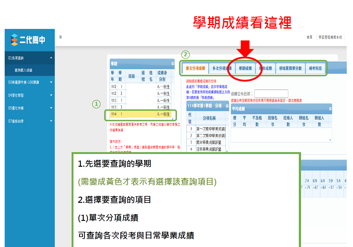另外,請參考下圖(注意查看學期成績的地方)及附件檔案「如何查看網路成績」
