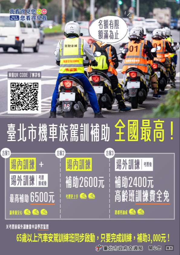 .方案1:機車駕訓+道路安駕訓練(考照前或後),最高補助6,500 元。