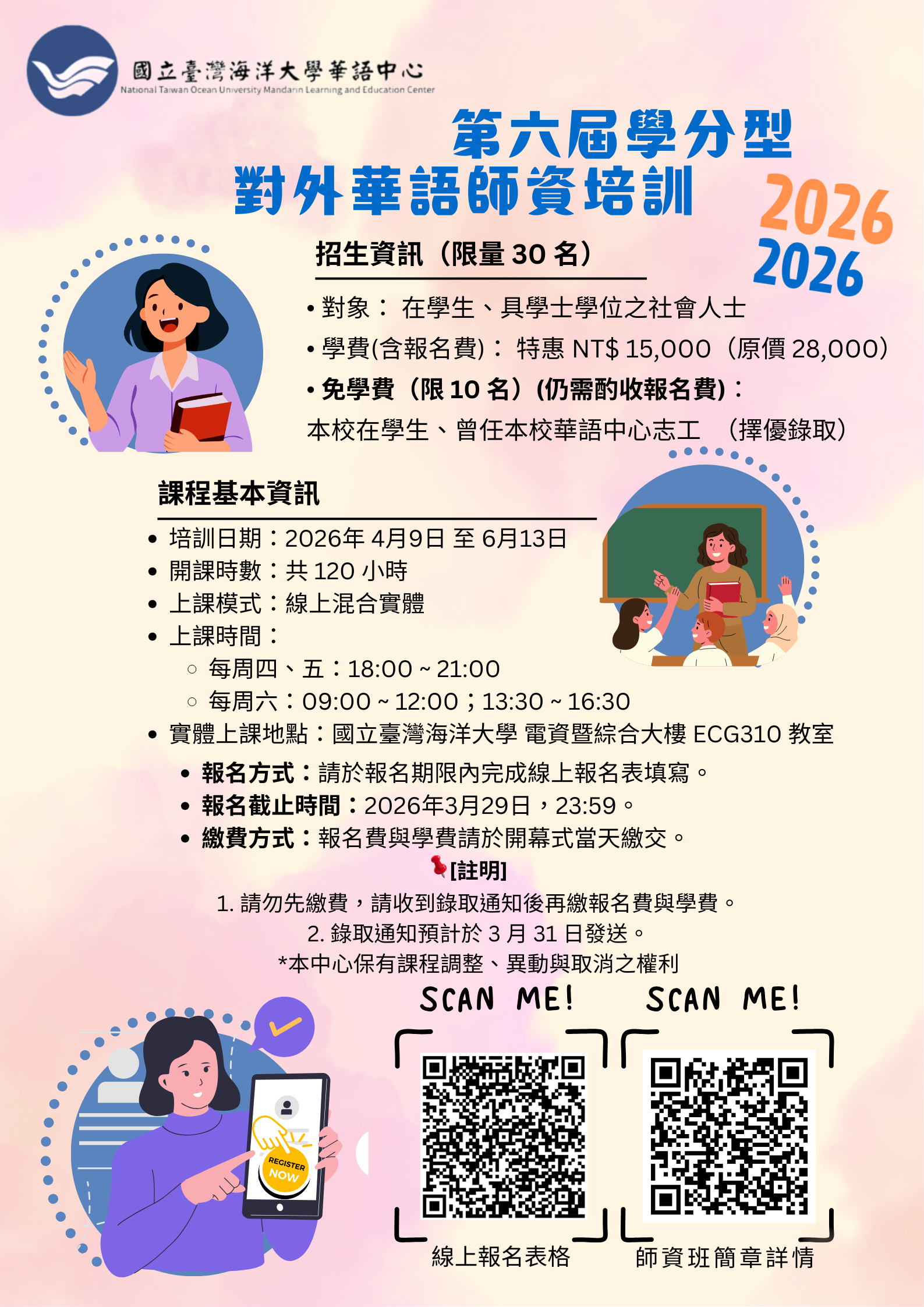 三、報名方式:請於115年3月29日23:59前完成線上報名填寫 ,錄取通知預計於3月31日以Email發送(未錄取者將不另通 知),詳情請參本中心官網https://r083.ntou.edu.tw/以 及本中心粉絲專頁https://www.facebook.com /NTOUxCLC。