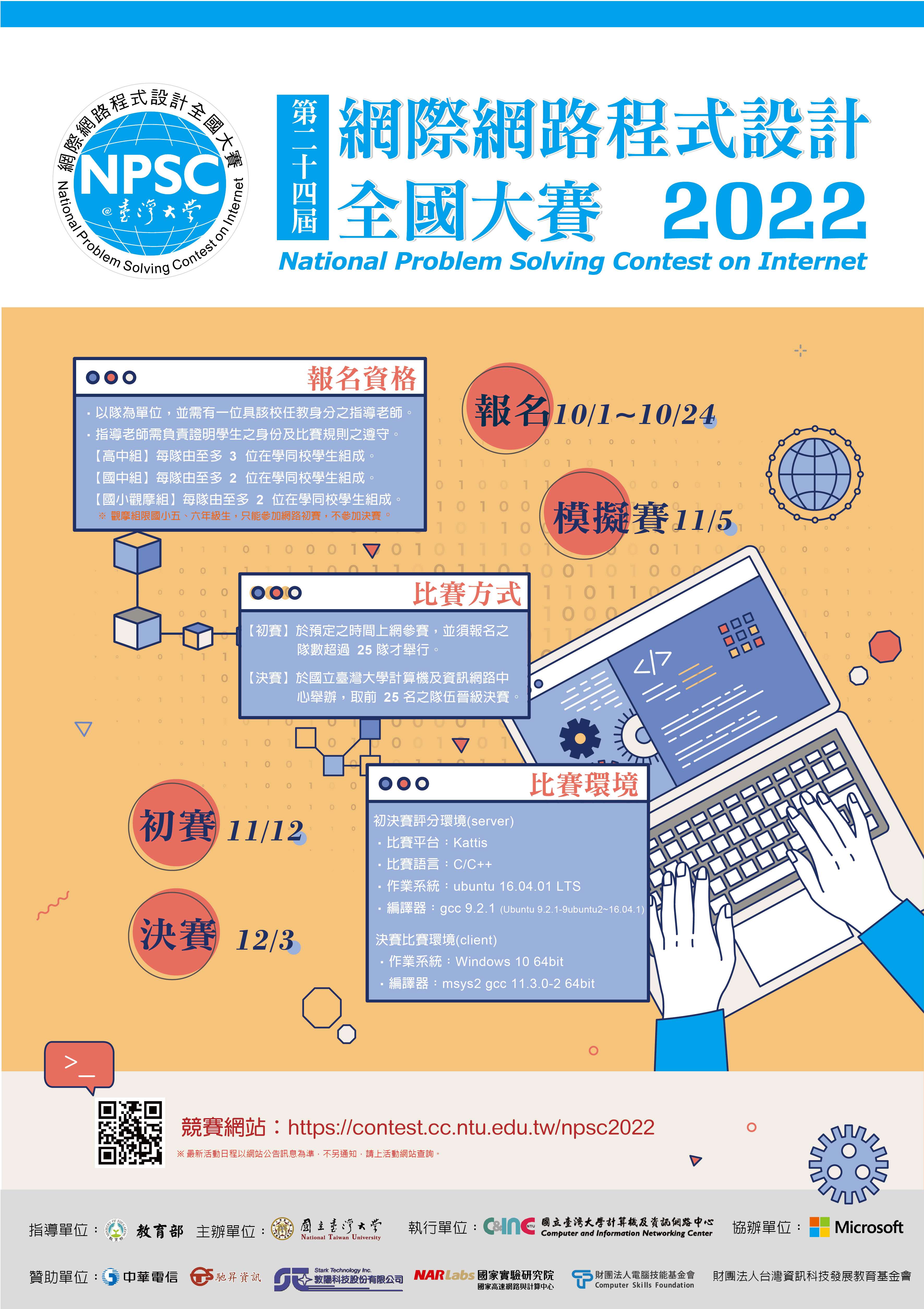 五、檢附參賽辦法及活動海報,詳附件。http://contest.cc.ntu.edu.tw/npsc2022/npsc2022poster.jpg