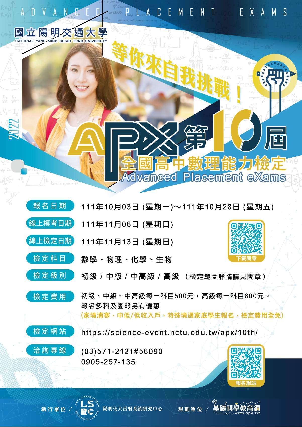 詳細內容請至國立陽明交通大學APX報名網站http://science-event.nctu.edu.tw/apx/10th 查詢、報名,