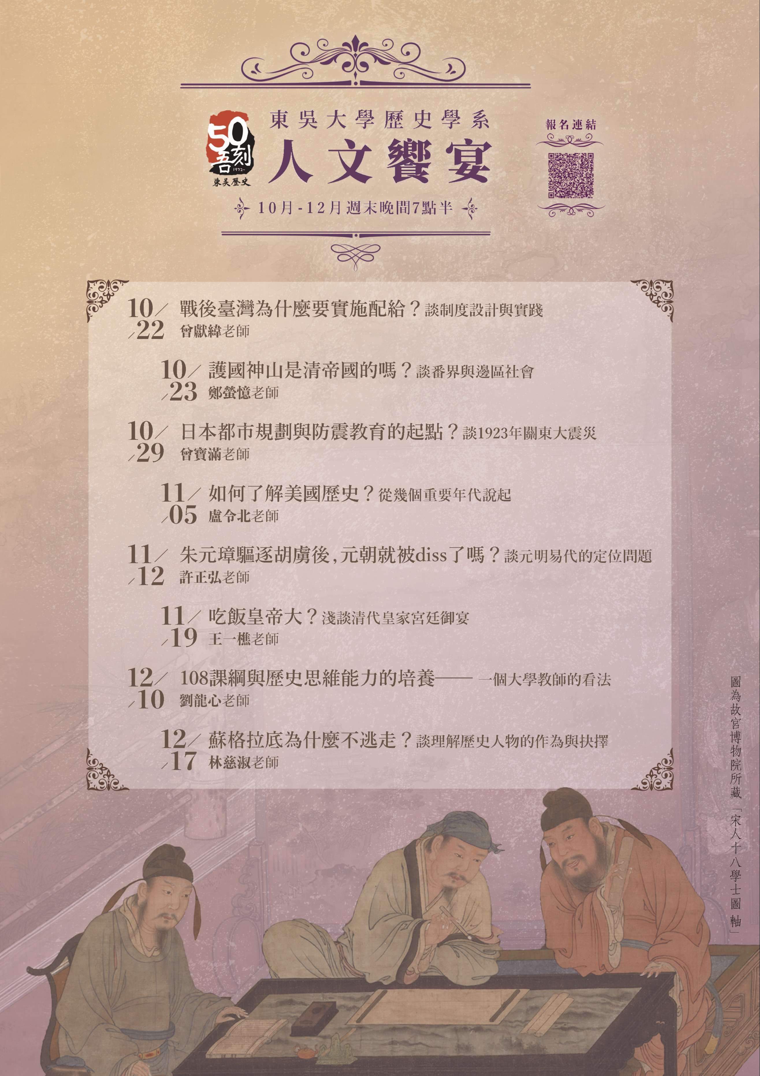 東吳歷史系今年適逢50周年系慶,因而策劃一系列線上人文講座,希冀能夠與高中學生、教師有更多知識交流。歡迎師生踴躍報名參與。