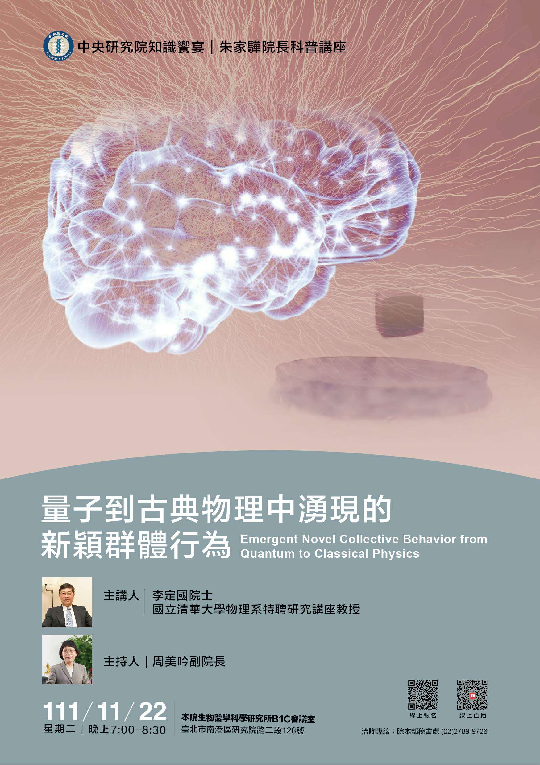 時間:11月22日晚間7時至8時30分,地點:本院生物醫學科學研究所B1C會議室。