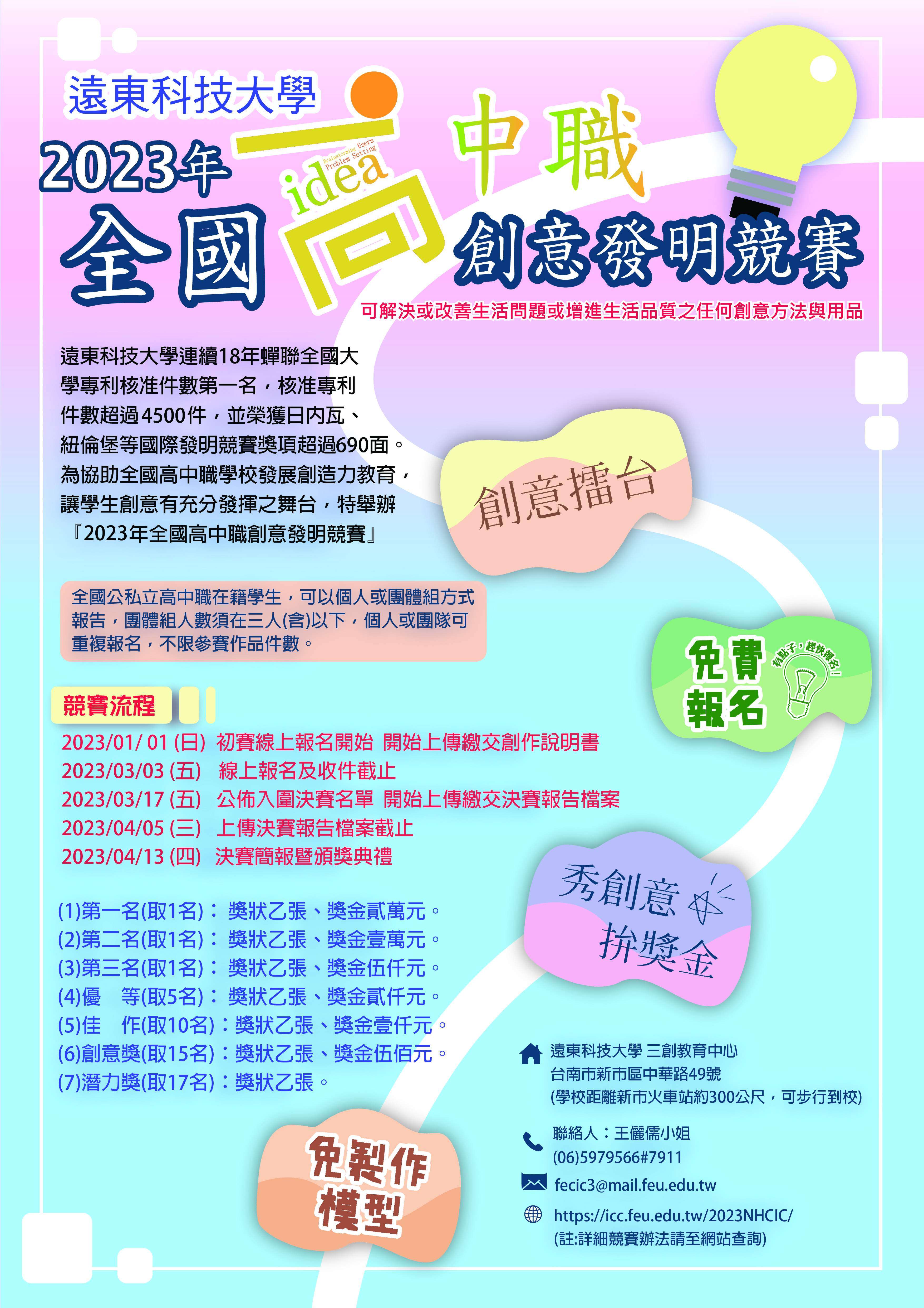 讓學生創意有充分發揮之舞台,本校特舉辦『2023年全國高中職創意發明競賽』。