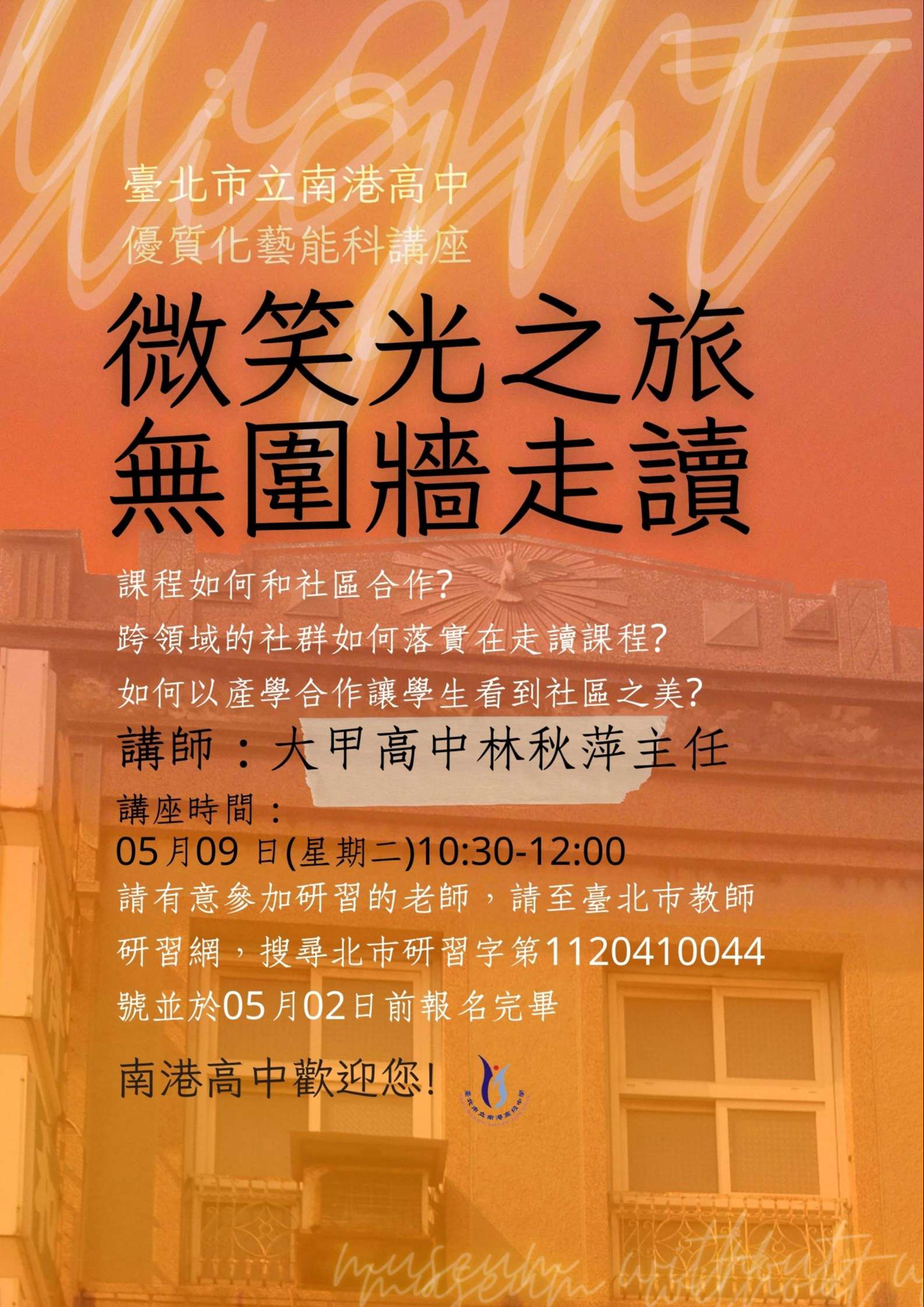 一、依本校111學年度高中優質化無圍牆走讀社群計畫辦理。 二、邀請國立大甲高中美工科主任林秋萍主任,分享校內推動 產學合作走讀課程經驗。 三、研習資訊: (一)時間:112年5月9日(星期二)10:30- 12:00 (二)地點:南港高中智慧教室 四、敬請惠予參加本研息教師公假。研習採線上報名,請有興 趣的老師,於5月2日前至臺北市研習網北市研習字第 1120410044號報名。 五、本校因停車車位有限,鄰近捷運昆陽站,請多利用大眾交 通工具,恕無法提供停車位。
