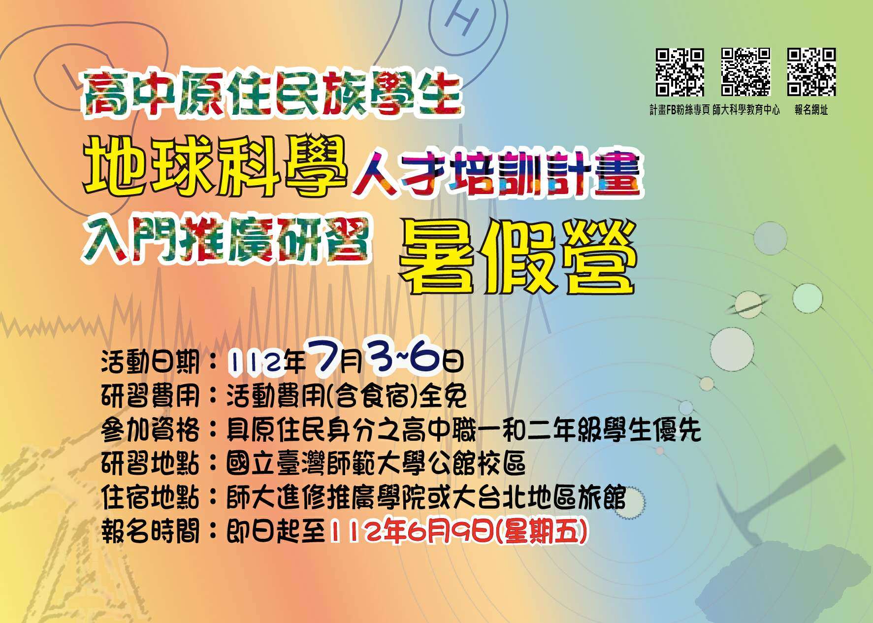 一、為培訓具地球科學研究性向或興趣之高級中等教育階段原住民族學生,