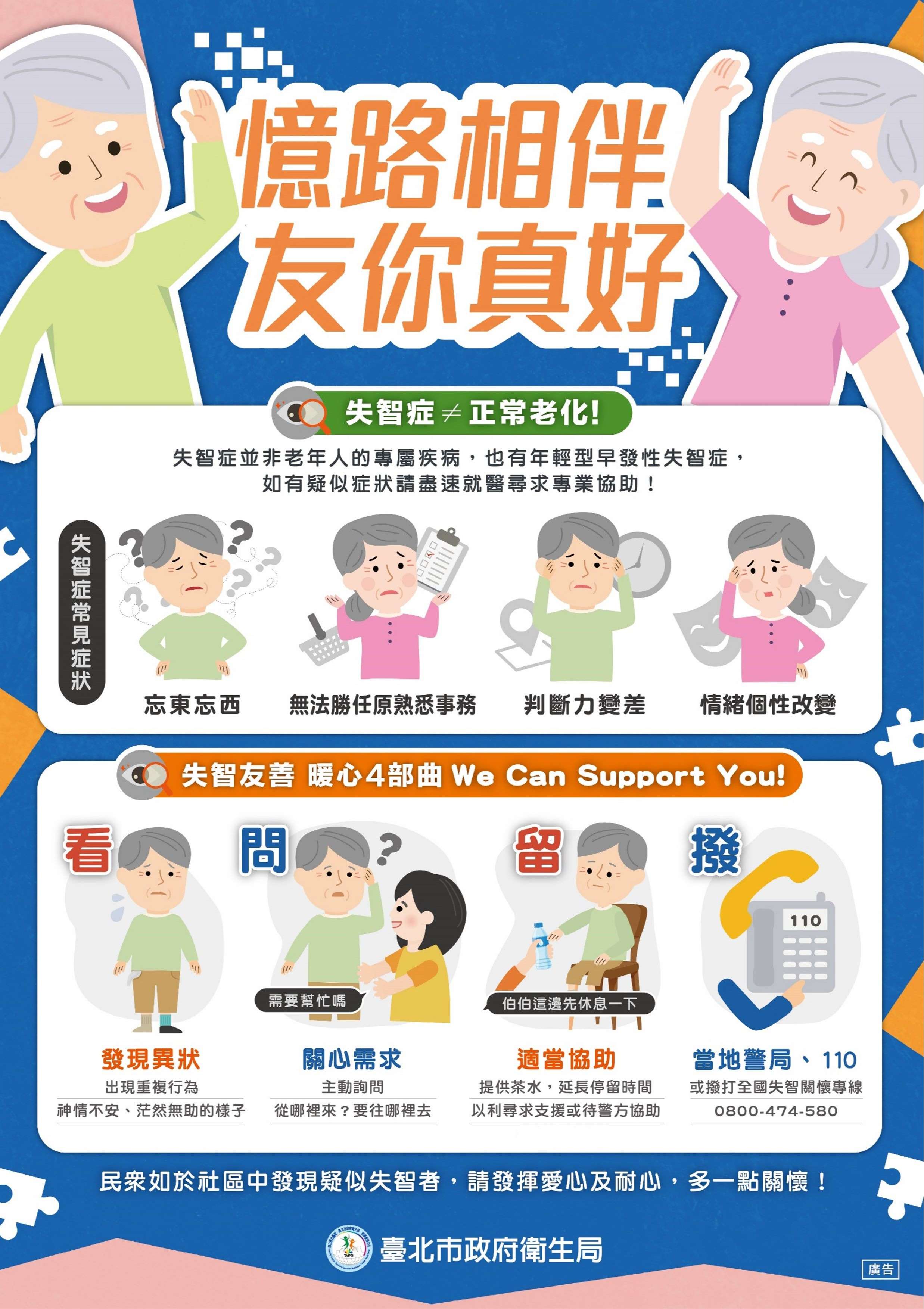 一、依據市府衛生局112年6月8日北市衛健字第11230240592號 函辦理。 二、本市自111年1月底邁入超高齡社會,推估失智症人口逾4萬 人,為增加市民朋友對失智症認識,市府衛生局製作旨揭 宣導海報,請貴單位協助宣導周知。 三、旨揭宣導海報電子檔置於市府衛生局網站(網址: https://reurl.cc/mDo0xj;路徑:首頁/主題專區/健康促 進/預防延緩失能專區/失智友善社區),歡迎下載運用。
