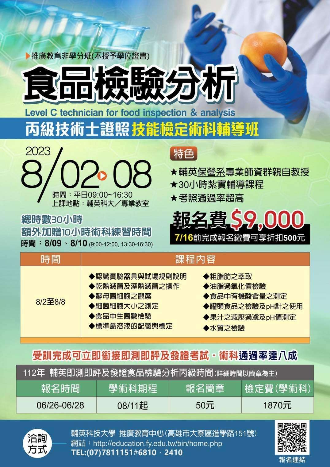 一、本校推廣教育中心開設「食品檢驗分析丙級技術士證照技能檢定術科輔導班」,