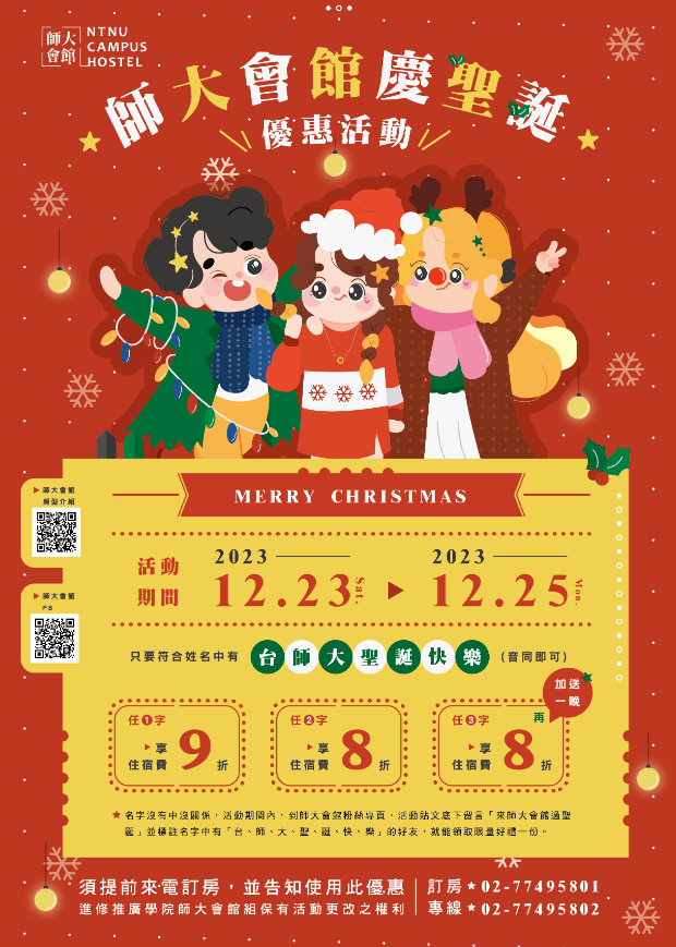 二、優惠期間為112年12月23日至112年12月25日,相關訊息及預約方式請詳閱本校師大會館網站https://www.sce.ntnu.edu.tw/home/accommodation/。