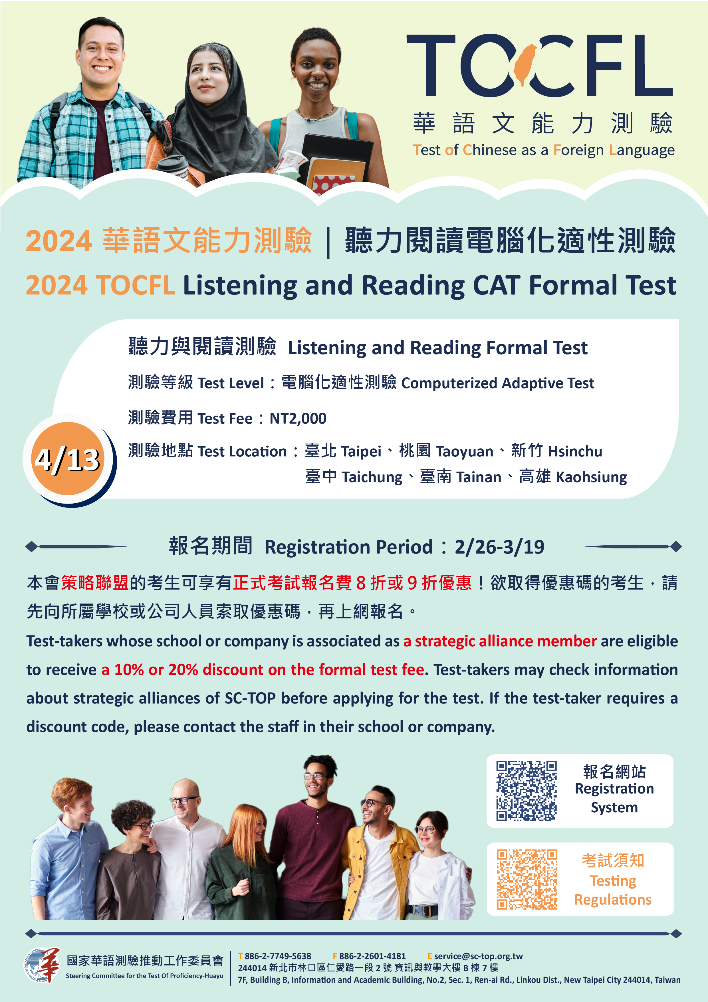 一、依據國家華語測驗推動工作委員會113年2月26日華測字第 1132000033號函辦理。 二、報名時間:113年2月26日(星期一)至3月19日(星期二) 止,報名截止日後倘有剩餘名額,將開放追加報名至3月22 日止。 三、測驗日期:4月13日(星期六)。 四、測驗項目:聽讀測驗:電腦化適性測驗。 五、測驗地點:國立臺灣師範大學、國立臺北教育大學、國立 臺灣大學、中國文化大學推廣教育部、德明財經科技大 學、中原大學、新竹市光復高中、東海大學、國立臺中教 育大學、國立成功大學及文藻外語大學,共11所考試中 心。 六、測驗費用:新臺幣2,000元。 優惠訊息:為該會策略聯盟單位所屬外籍人士可享九折優 惠。 八、報名網址:https://reg.sc-top.org.tw/。 九、線上模擬測驗:https://tocfl.edu.tw/index.php/exam /test/page/19。 十、倘對本測驗尚有疑問,請逕洽該會承辦人員王郁涵小姐, 聯絡電話:02-77498204。