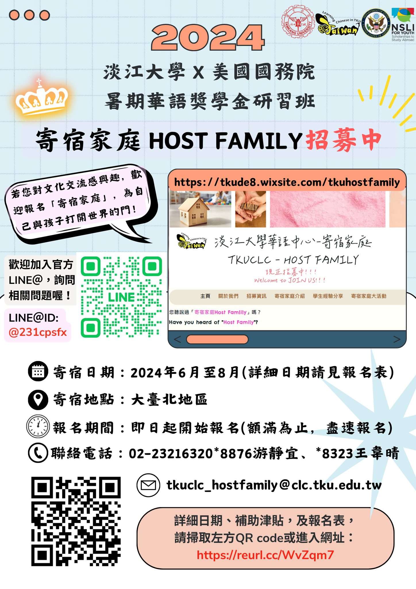 淡江大學推廣教育處華語中心承辦2024年暑期「美國國務院華語獎學金研習班」,擬徵選臺灣寄宿家庭,敬請有意願同學踴躍報名(詳閱附件檔說明)。