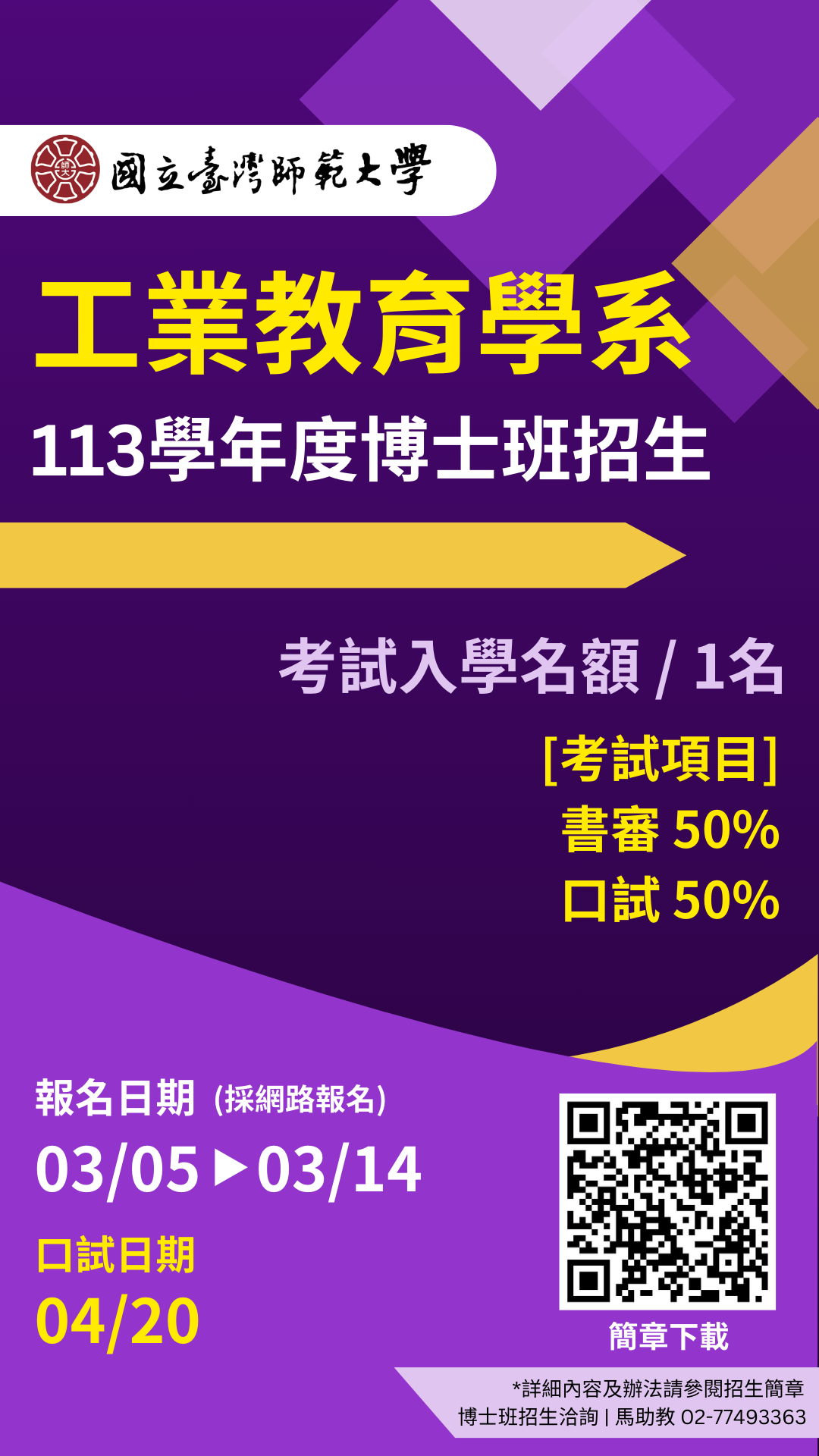 二、相關招生資訊,請參閱招生宣傳海報(如附件)或至考試入學招生網頁 (https://enroll.itc.ntnu. edu.tw/Enroll/PhdEntry) 查詢。