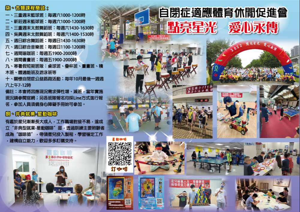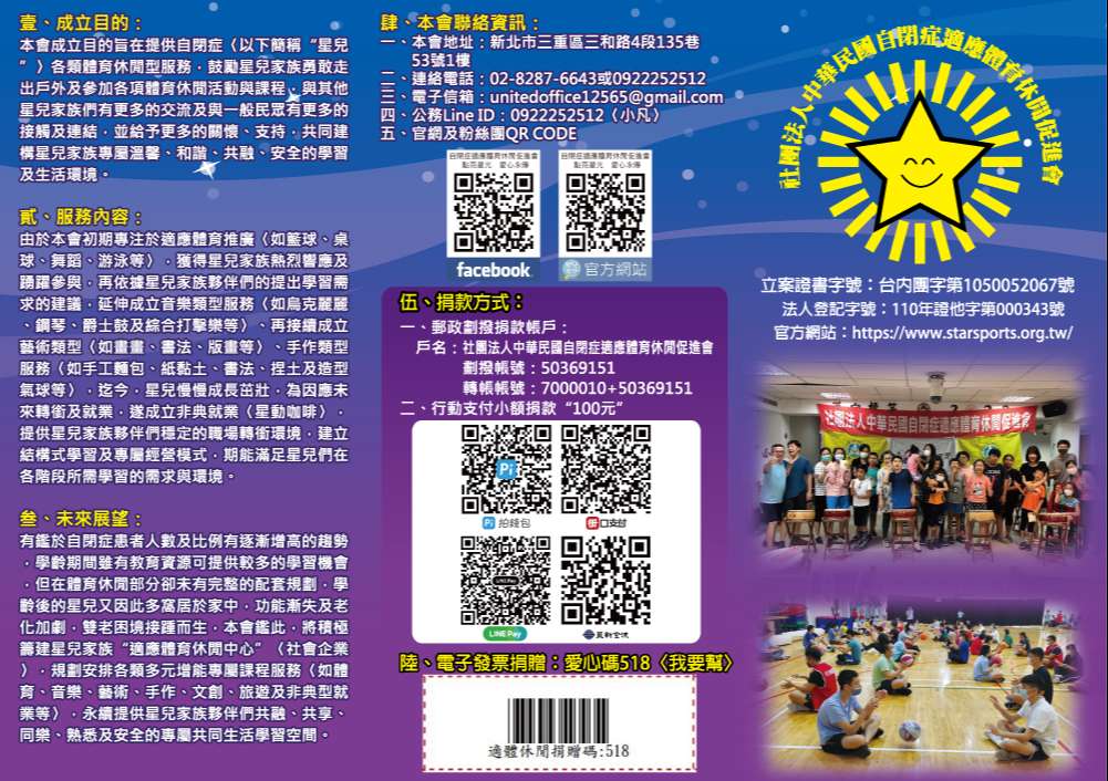 二、本會長期致力於自閉症者〈以下簡稱“星兒”〉各項體育〈籃球、桌球、水適能、舞蹈等〉及休閒〈藝術創作、音樂培養、手作工藝等〉等服務,期能提供星兒家庭專屬合
