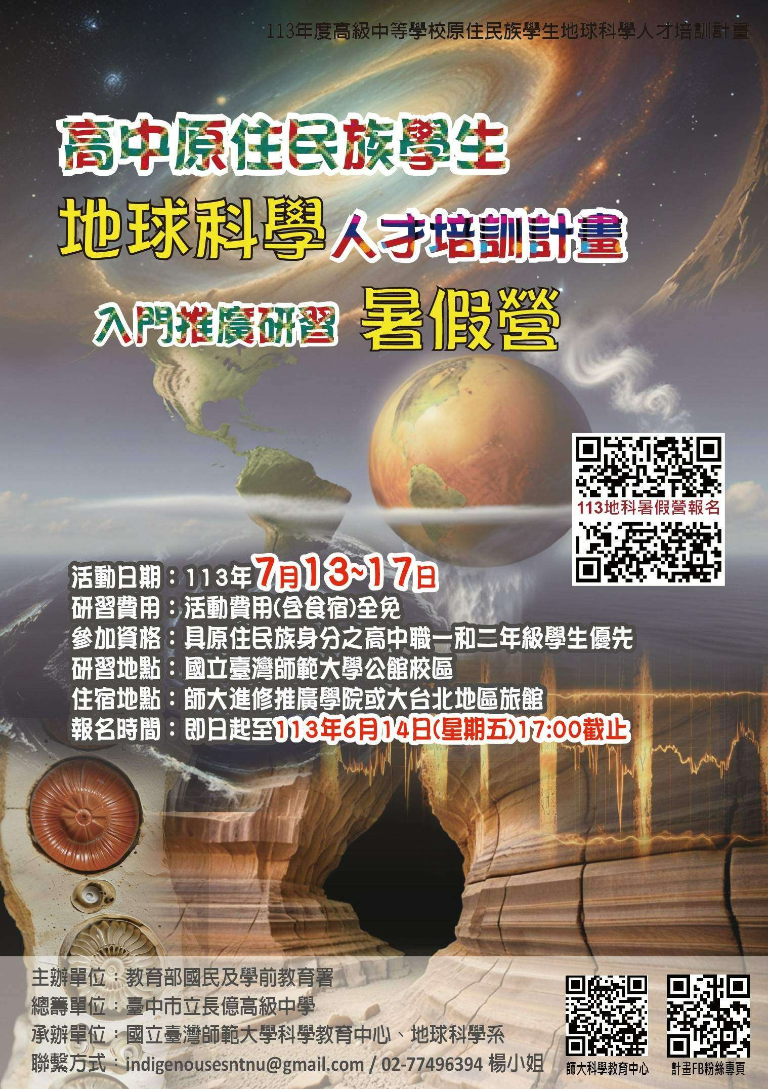一、為培訓具地球科學研究性向或興趣之高級中等教育階段原住民族學生,
