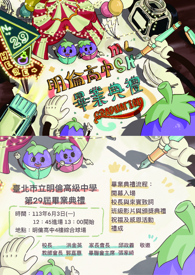 06月03日(一)畢業典禮 12:45 始開放家長、來賓等入校,感謝配合。 禮成後請家長配合離場,畢業生將進行校園巡禮,請家長耐心等候。