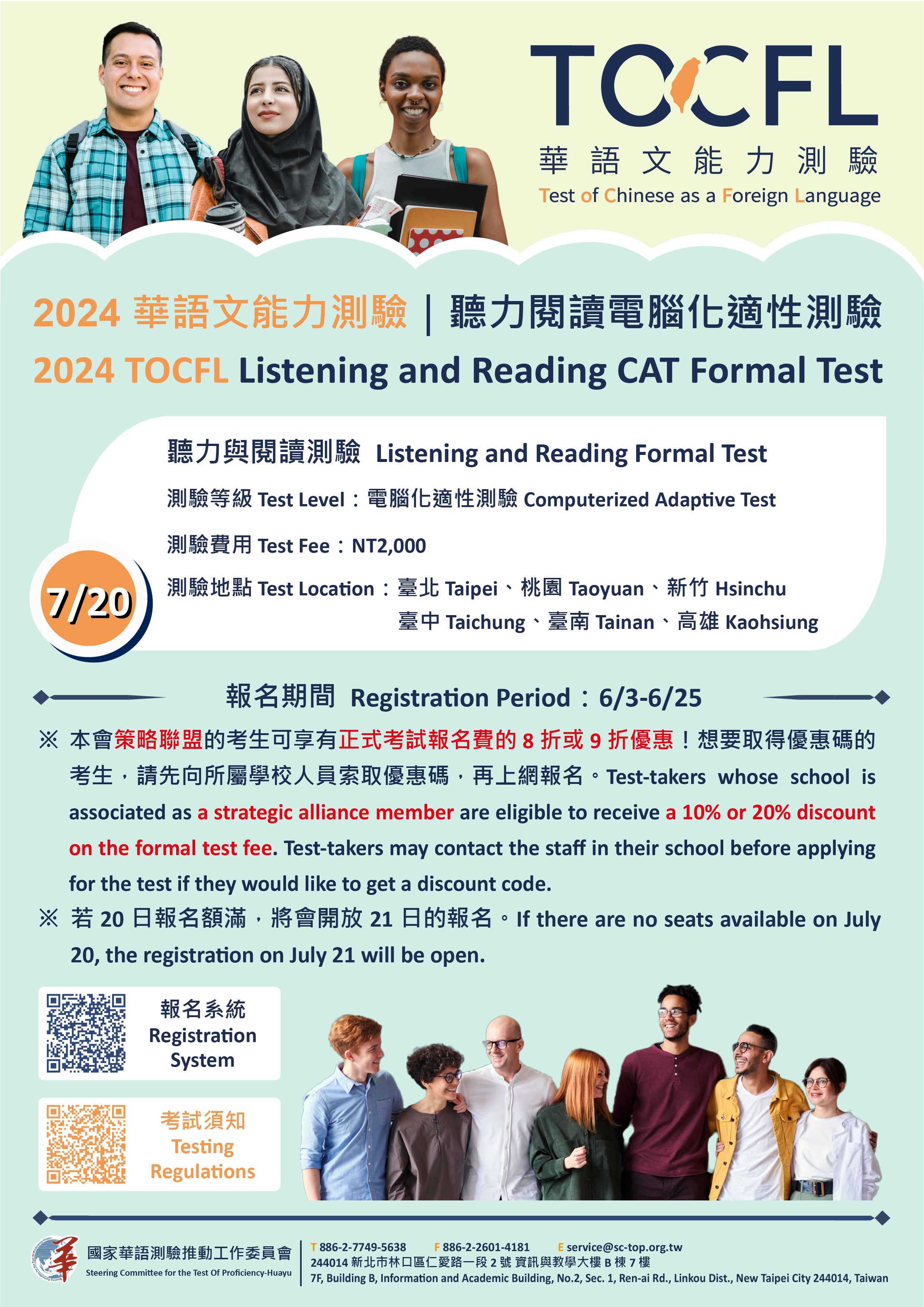 說明: 一、依據國家華語測驗推動工作委員會113年6月4日華測字第 1132000079號函辦理。 二、報名時程:113年6月3日(星期一)至6月25日(星期二) 止,報名截止日後,若有剩餘名額,將開放追加報名至6月 28日(星期五)止。 三、考試日期:113年7月20日(星期六)。若星期六場次額 滿,將加開7月21日(星期日)場次。 四、考試項目:聽讀測驗—電腦化適性測驗。 五、測驗費用:新臺幣2,000元。 六、優惠訊息:為該會策略聯盟單位,所屬外籍人士可享九折 優惠。 七、報名網址:https://reg.sc-top.org.tw/。八、線上模擬測驗:https://tocfl.edu.tw/index.php/exam /test/page/19。 九、檢附旨案宣傳海報1份。