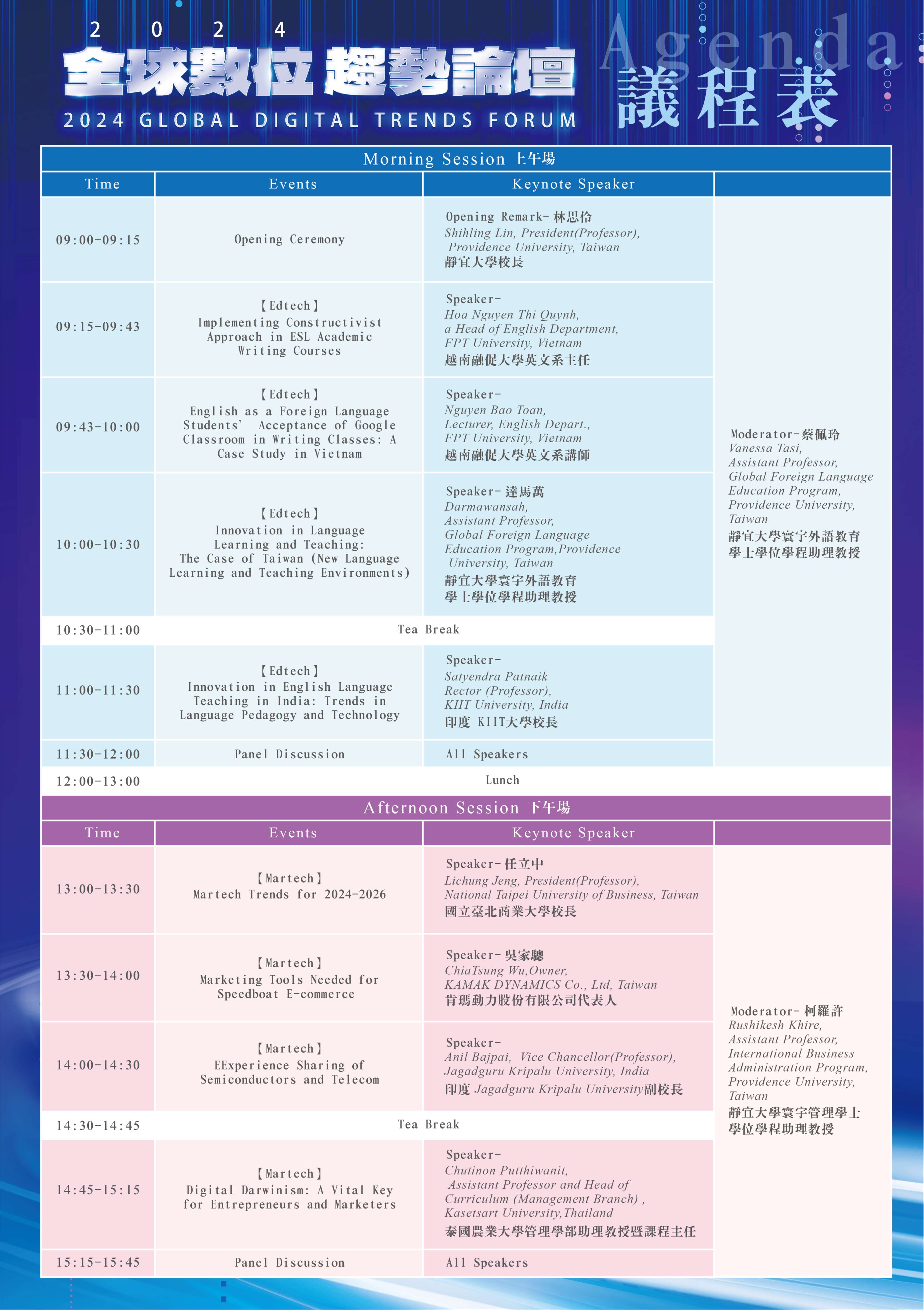 一、活動目的:邀請東南亞國家之專家學者至本校參與國際論 壇,透過分享各國在教育科技和行銷科技領域的最新研究 成果、實踐經驗以及創新技術,促進學術上的合作與交 流。 二、活動時間:113年10月4日(五) 上午9:00至下午4:00。 三、報名網址:https://activity.pu.edu.tw/actnews /signup.php?Sn=35 四 、報名截止時間:113年10月1日 (二)。 五、檢附論壇海報及議程表,敬請協助公告宣傳。 六、活動聯絡人:白書榕助理,聯絡電話:04-26328001分機 19251,聯 絡信箱:sjpai2@pu.edu.tw。