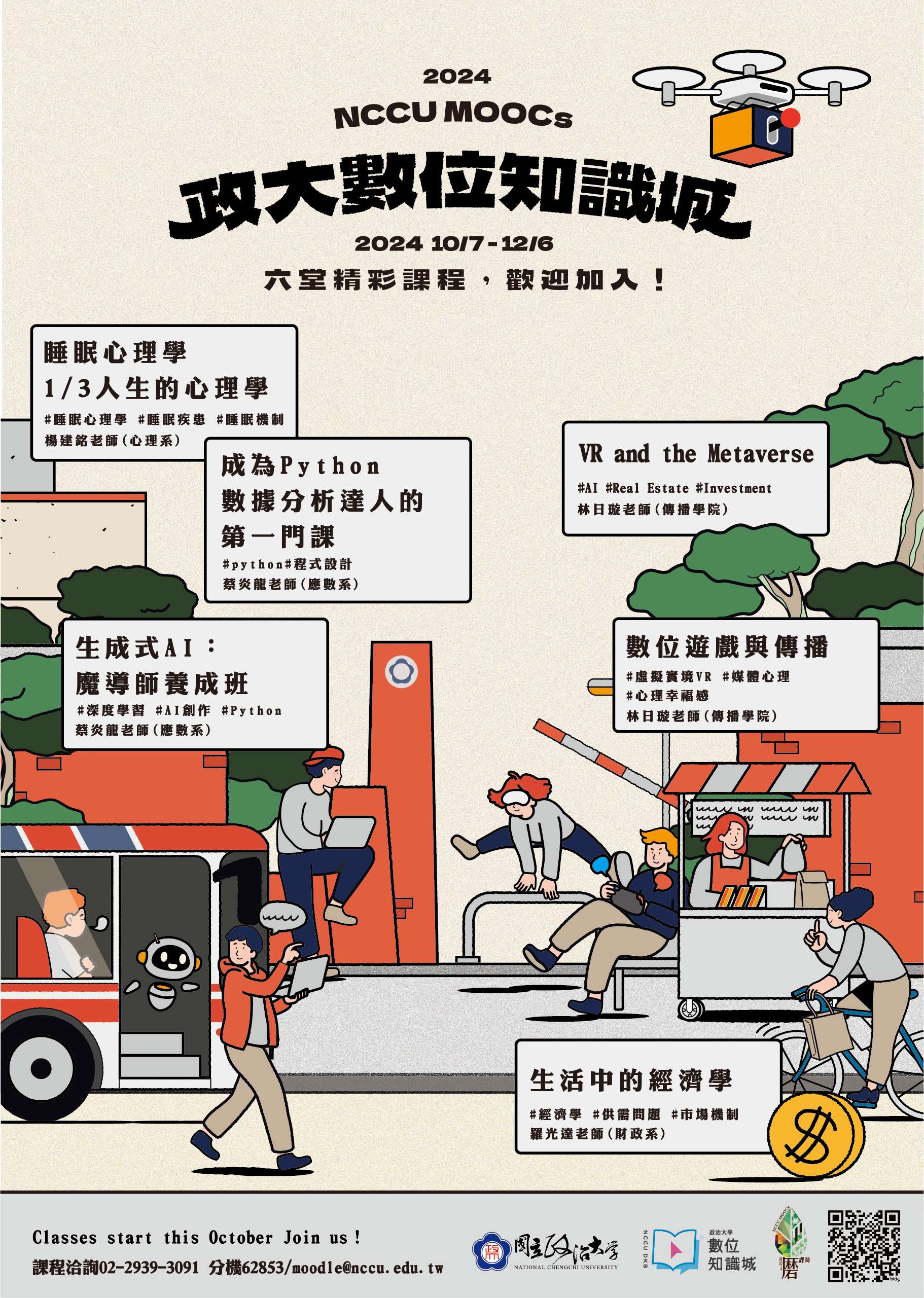 一、本校於政大數位知識城平台( 網址:https://bit.ly /3AiRM0O)113學年度第1學期開設6門磨課師線上課程,即 日起開放線上註冊報名。 二、旨揭課程資訊如下: (一)「睡眠心理學-1/3人生的心理學」 1、授課教師:心理系楊建銘教授 2、課程介紹:介紹睡眠的生理、情緒影響及相關疾患, 帶領學習者了解睡眠對日常功能的影響,提升生活品 質。 (二)「成為Python數據分析達人的第一堂課」 1、授課教師:應數系蔡炎龍副教授 2、課程介紹:課程從Python開始學習基礎的程式邏輯與 概念,強調「貼近自己的程式設計」,引導學員觀察 自己的生活,寫出有趣的程式。 (三)「生成式 AI:魔導師養成班」 1、授課教師:應數系蔡炎龍副教授 2、課程介紹:介紹生成式AI,涵蓋理論與實踐操作,學 生將學習技術應用,開發AI模型並探索未來科技創 新。 (四)「Virtual Reality and the Metaverse」 1、授課教師:林日璇特聘教授 2、課程介紹:This course covers virtual reality traits, applications in various industries, and the concept and development of the metaverse. (五)「數位遊戲與傳播」 1、授課教師:林日璇特聘教授 2、課程介紹:探討數位遊戲設計及其對閱聽人影響,涵 蓋新聞遊戲、廣告說服、暴力內容等,並綜觀遊戲研 究趨勢。 (六)「生活中的經濟學」 1、授課教師:羅光達教授 2、課程介紹:本課程著重於讓學習者去「體驗」生活中 所面臨的經濟問題,並以主題式的教學方式介紹經濟 學的相關知識。 三、檢附旨揭課程海報乙份,敬請協助公告。 四、如有任何垂詢,請聯繫本校教務處教學發展中心高心柔小 姐,電話 (02)2939-3091分機62176,電子信箱: shinrou@nccu.edu.tw。