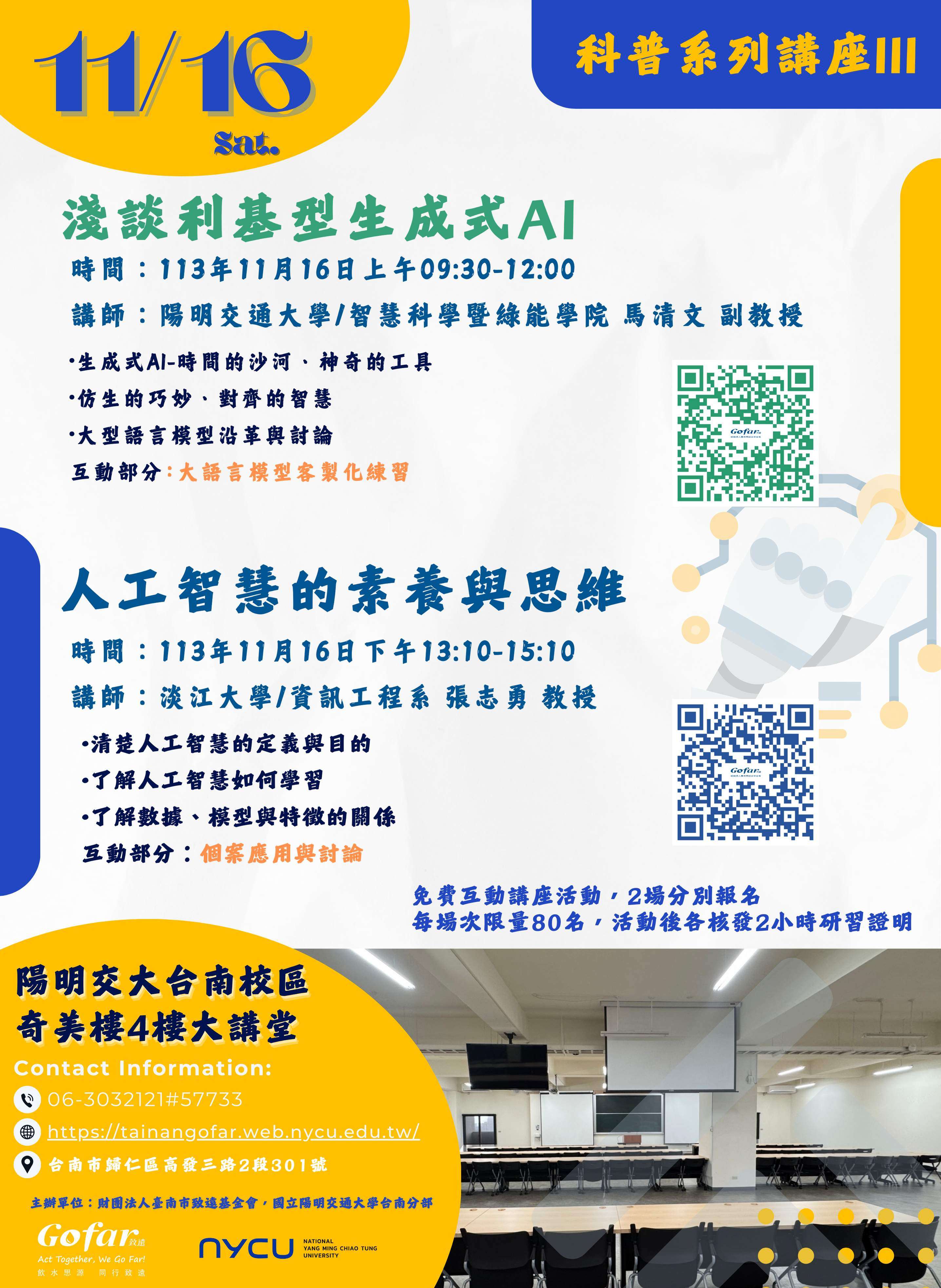 (一)113年11月16日上午9:30至12:00(報到時間為9:30至9:40)及下午13:10至15:10,兩場活動可分別報名。