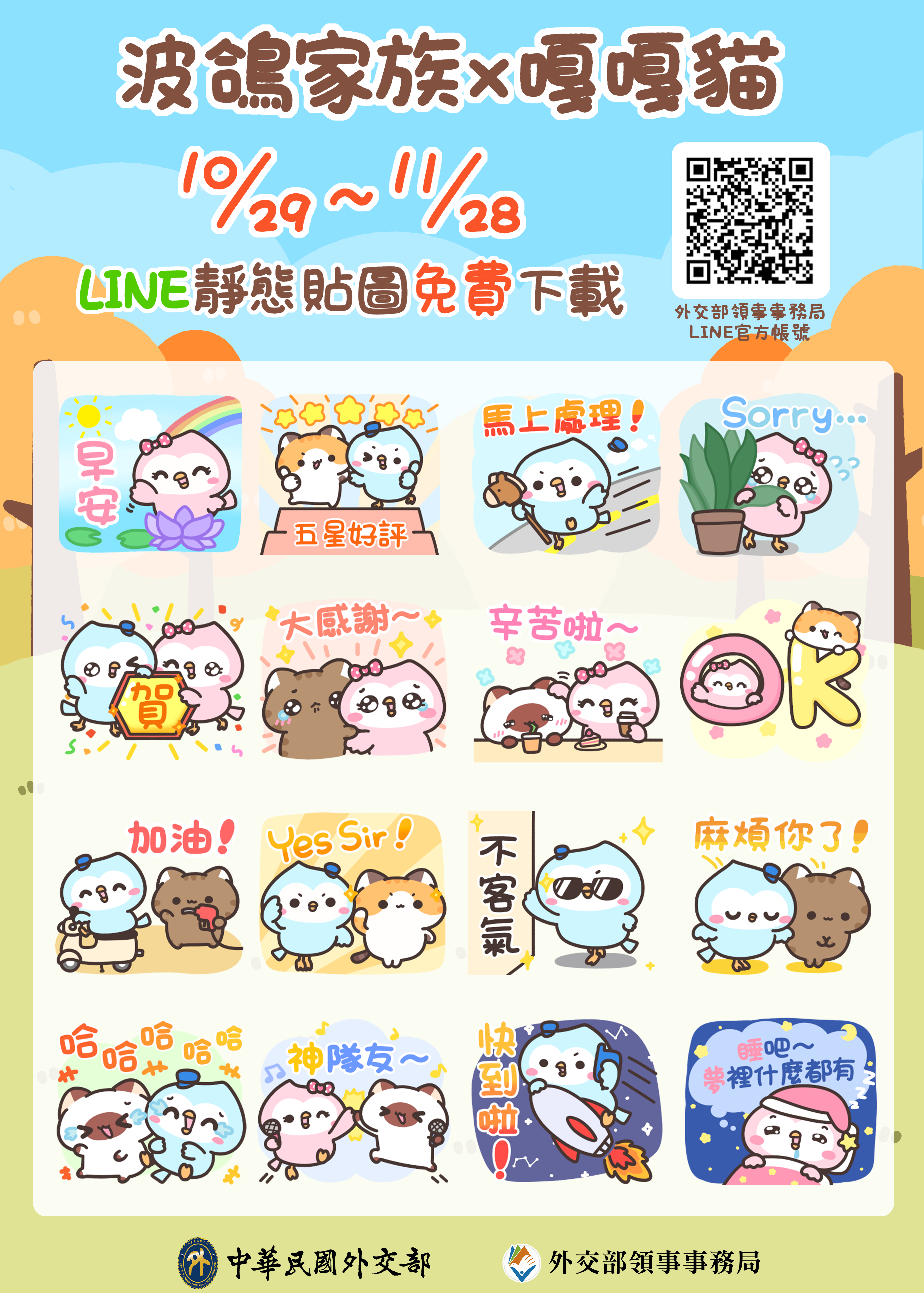 (一)「波鴿家族x嘎嘎貓」靜態貼圖免費下載及人氣票選抽獎活動(活動期間:113年10月29日至11月28日):凡加入領務局LINE官方帳號好友,即可免費下載16張靜態貼圖並使用180天,並於活動期間同步完成貼圖人氣票選抽獎活動,就有機會抽中限量「波鴿&嘎嘎貓限量杯墊」。(活動詳情:https://www.boca.gov.tw/cp-56-7672-e9e5c1. html)。